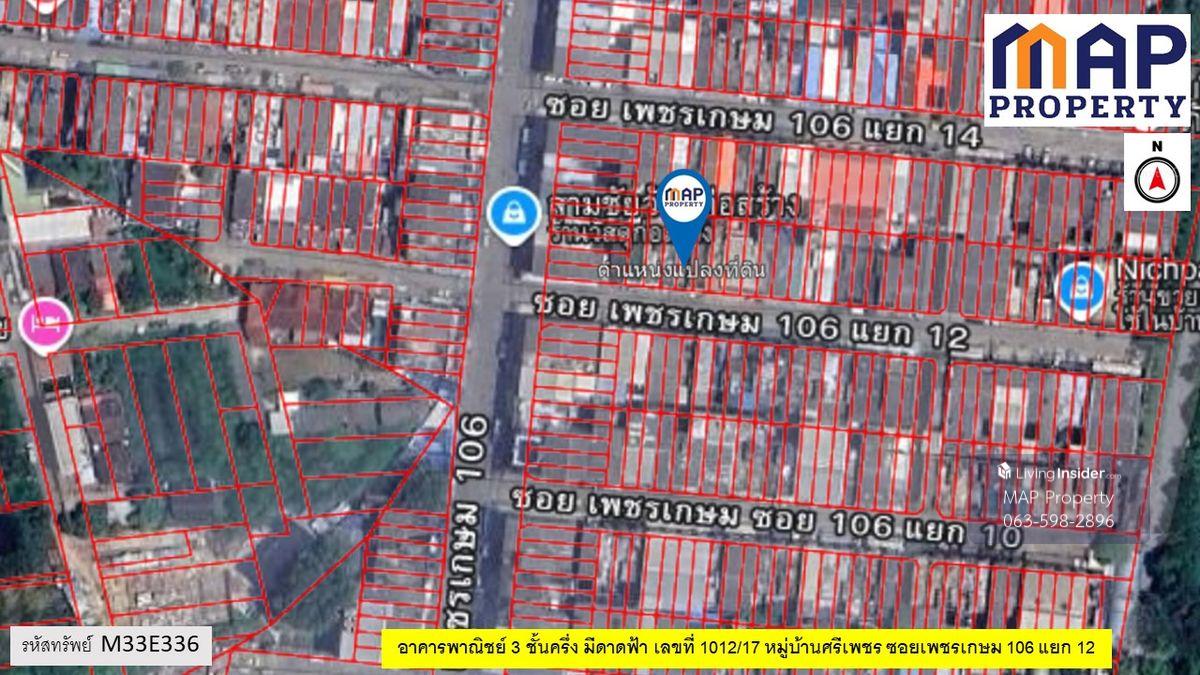 - 3-story commercial building for sale with mezzanine and rooftop. - Includes 20 square wah (1,000 sq m) of land. - Located in the Sri Petch Village project, Soi Petchkasem 106, Intersection 12, Tha S