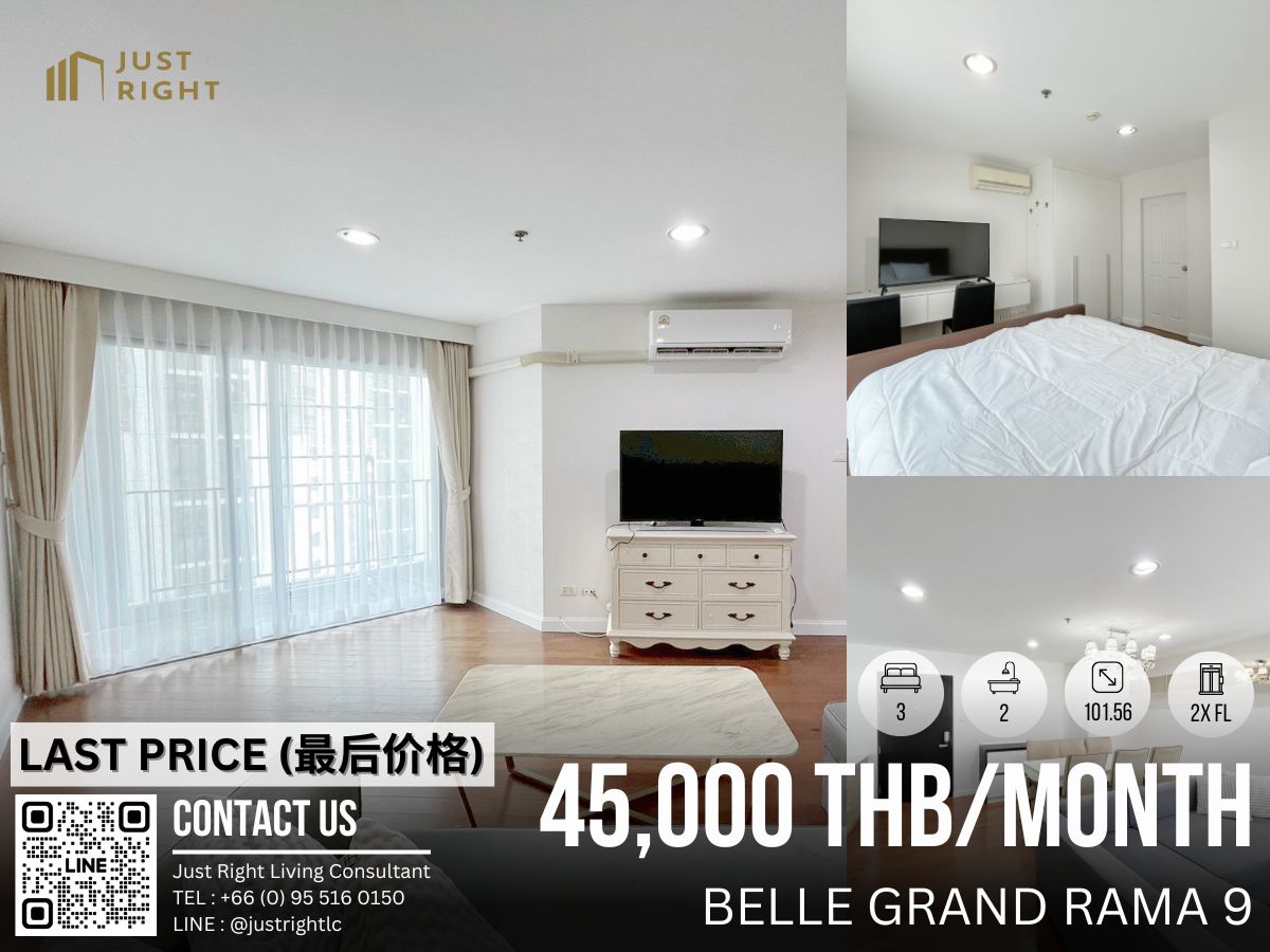For rent, Belle Grand Rama 9, 3 bedrooms, 2 bathrooms, 101.56 sq m, C2 Tower, north, 2xth floor, fully furnished, complete with electrical appliances, special price from 55,000 only 45,000/m 1-2 y contract *Chinese Below* -------------------------------------------------- Type : 3 bedroom, 2 bathroom Size : 101.56 square meters Floor : 2x Furniture and electrical appliances : Fully Provided, Ready to move-in Rental price : 45,000 baht per month *1 month in advance, 2 months deposit* *Minimum contract period 1 year* -------------------------------------------------- For viewing appointment or further more information please contact Tel : Contact number Line : @justrightlc WhatsApp : Contact number WeChat ID : k Contact number Website : www.justrightlc.com ** If you looking for renting or purchasing condo for in a nearby location, Please feel free to contact us for more information or consultation ** ** If you prefer to rent out or sell out your condo, Please feel free to contact us or consultation ** -------------------------------------------------- 代码 : 10605204 户型 : 3 间卧室,2 间浴室 面积:101.56 平方米 楼层:2x 家具电器:全包,可以马上入住 租金:每月 45,000 泰铢 入住前付款:1 租+ 2 押金 最短合同期1年 -------------------------------------------------- 如果您有兴趣需要进一步的资料,约看房,请您立即联络,我们有中文服务销售 电话: Contact number 线路:@justrightlc 瓦次艾普 : Contact number 微信号:k Contact number(扫二维码) 网站:www.justrightlc.com ** 如果您在寻找附近公寓出租或购买,请您联系我们获取更多信息或咨询 ** ** 如果您有房源需要出租/出售 请您联系我们获取更多信息或咨询 **