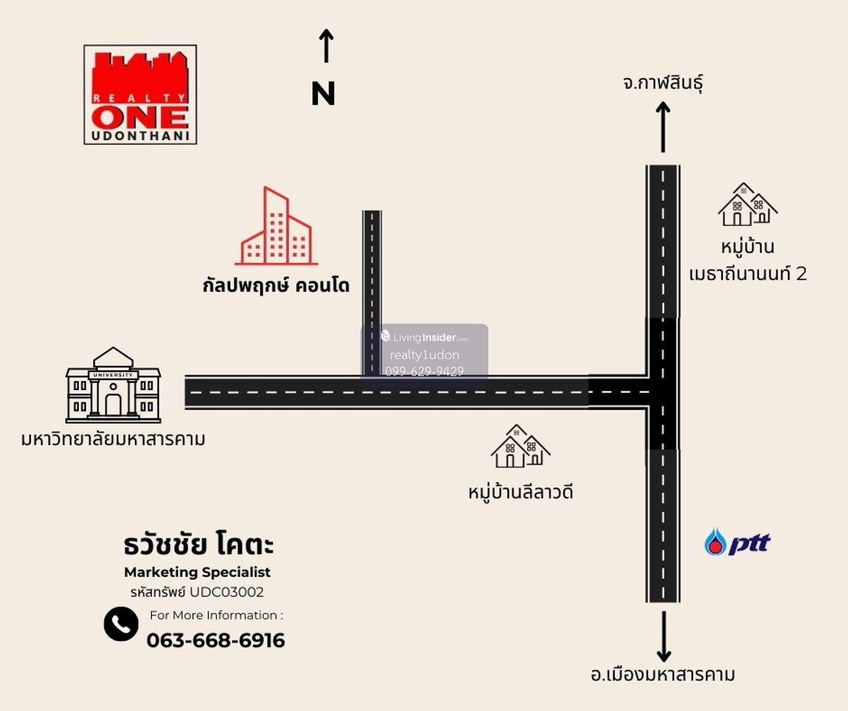 Details *Area 28.45 Sq. Usable area 26.59 sqm. *8 -story building on the 2nd floor, room 711/7 *1 bedroom, 1 bathroom 1 air *Refrigerator cabinet, work table, fan sofa *Central value 12,350.00 baht/year (this year)*? Mahasarakham University, only 200 meters Facilities *Security 24 hours/CCTV/Keycard/Parking/Swimming Pool/Fitness Nearby locations *Maha Sarakham University *Big C Maha Sarakham *Jae Hon Tha Khon Yang Restaurant ======= Price 1,300,000.00 ========== Interested in making an appointment to see the location Ready to contact the free loan. Contact Thawatchai Kota Contact number