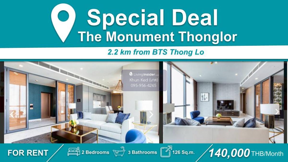 FOR RENT The Monument Thonglor ㅡ 2 Bedrooms 3 Bathrooms ㅡ Area 126 sq m. Fully furnished + electrical appliances Rental price 140,000 baht/month For inquiries, please contact Tel.: Contact number (K.Ked) LINE: https://line.me/ti/p/yMJI4Iqfx_