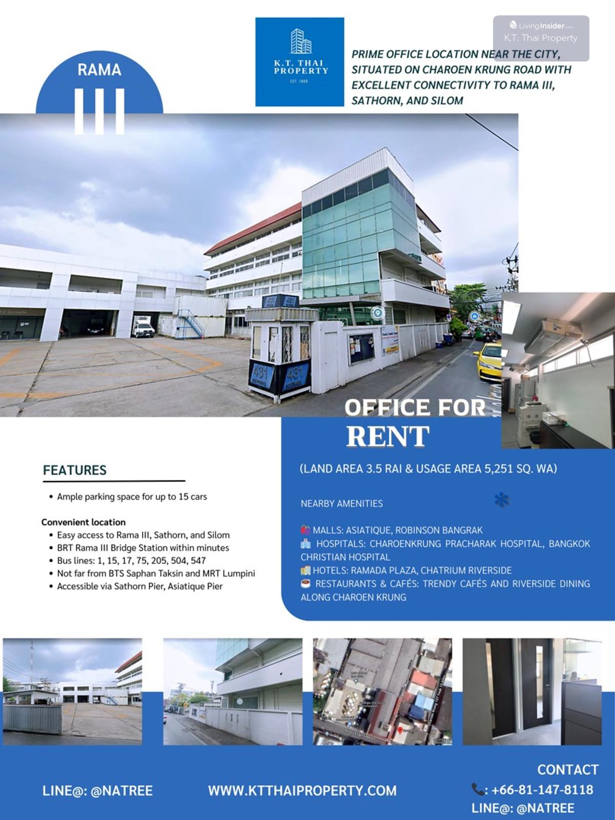 🏢 Prime Office for Rent on Charoen Krung Road Modern 4-Storey Office with Private Parking in a Vibrant Riverside District 📍 Property Overview A contemporary 4-storey office building for rent, located on Charoen Krung Road—one of Bangkok’s most historic yet fast-developing areas. Easy access to Rama III, Sathorn, and Silom makes it an ideal spot for businesses seeking both connectivity and charm. • Land Area: 2 Rai 1 Ngan 75 Sq.Wah (3,475 sq.m.) • Building: 4-storey office with modern design • Parking: 20 private parking spaces • Accessibility: Convenient access to main business roads and riverside attractions 🏙️ Prime Location Benefits • Surrounded by Bangkok’s cultural charm and lifestyle destinations • Direct access to business districts and major arterial roads • Suitable for company headquarters, creative agencies, or serviced offices 🛎️ Nearby Amenities • Shopping: Asiatique, Robinson Bangrak • Hospitals: Charoenkrung Pracharak Hospital, Bangkok Christian Hospital • Hotels: Ramada Plaza, Chatrium Riverside • Dining: Riverside cafés and trendy restaurants 💼 Rental Terms • For Rent Only • Price: Negotiable 📞 Contact Us • Phone: Contact number (Pear) • Line: @natree • Website: www.ktthaiproperty.com