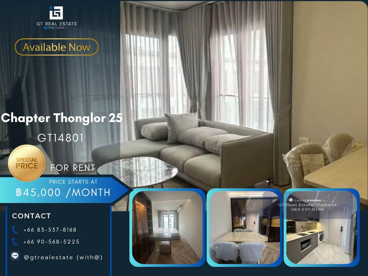 Code: GT14801 Project: Chapter Thonglor 25 Type: 2 bedrooms, 2 bathrooms Size: 58 sq.m. Floor: 5+ Building: - MRT/BTS: BTS Thonglor Retal Price: Special price only 45,000 baht per month !!! From the n