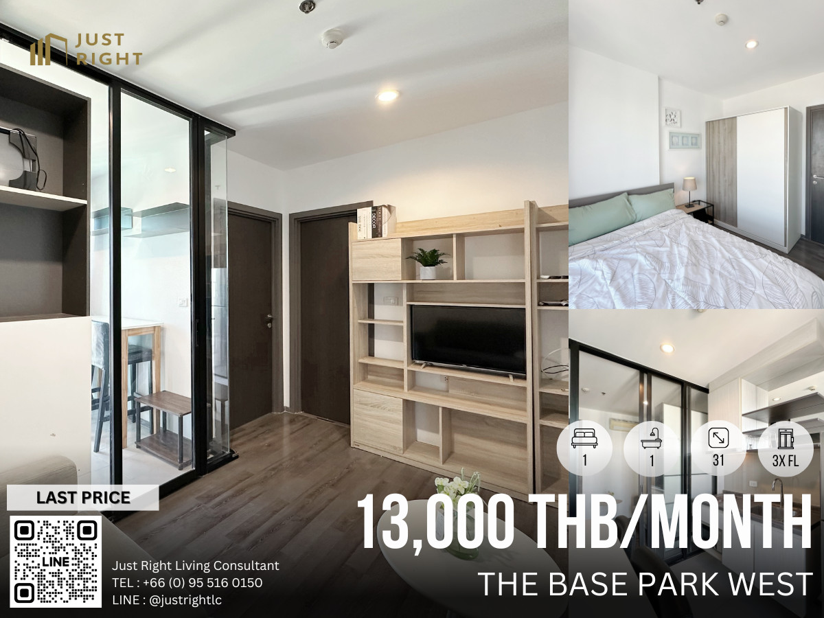 The Room ready to viewing and move in 30.10.2025 For rent, The Base Park West 31*sq.m., 1 bedroom, 1 bathroom, 3x floor, Full furnish Special price only 13,000 baht/month, 1 year contract only *Chinese Below* -------------------------------------------------- Type : 1 bedroom, 1 bathroom Size : 31* square meters Floor : 3x Furniture and electrical appliances : Fully Furnished Rental price : 13,000 baht per month *1 month in advance, 2 months deposit* *Contract 1 year only* -------------------------------------------------- For viewing appointment or further more information please contact Tel : Contact number Line : Contact number WhatsApp : Contact number WeChat ID : k Contact number Website : www.justrightlc.com ** If you looking for renting or purchasing condo for in a nearby location, Please feel free to contact us for more information or consultation ** ** If you prefer to rent out or sell out your condo, Please feel free to contact us or consultation ** -------------------------------------------------- 户型 : 1 间卧室 1 间浴室 面积:31* 平方米 楼层:3x 家具电器:全包,可以马上入住 租金:每月 13,000 泰铢 入住前付款:1 租+ 2 押金 最短合同期 1 年 -------------------------------------------------- 如果您有兴趣需要进一步的资料,约看房,请您立即联络,我们有中文服务销售 电话: Contact number 线路: Contact number 瓦次艾普 : Contact number 微信号:k Contact number(扫二维码) 网站:www.justrightlc.com ** 如果您在寻找附近公寓出租或购买,请您联系我们获取更多信息或咨询 ** ** 如果您有房源需要出租/出售 请您联系我们获取更多信息或咨询 **
