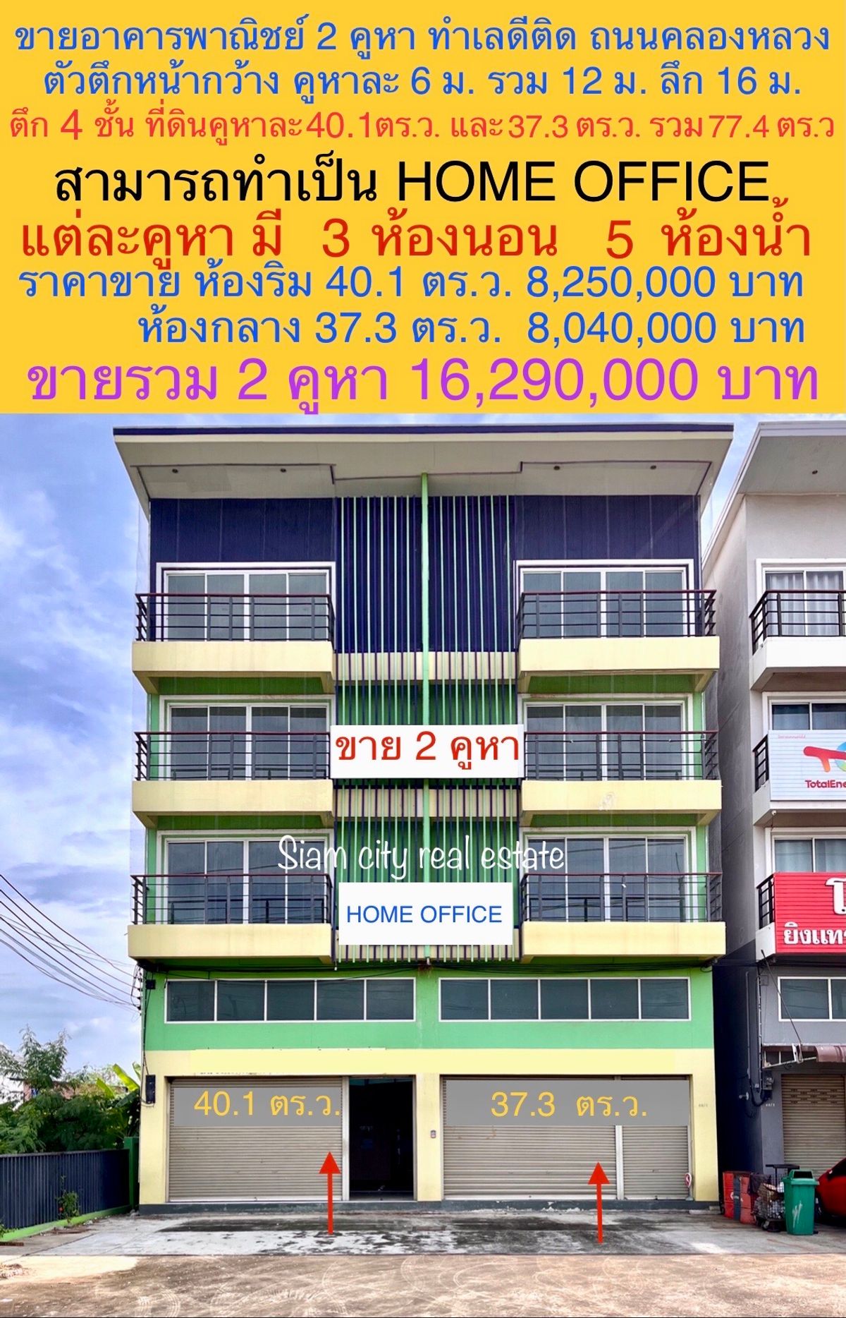 Buy 1 to 2 to do business. Can live ⭐️ Selling Home Office is a large 2 booths ⭐️ Inside the building decorated beautifully ⛳️ on a golden location next to Khlong Luang Road, Khlong Si Subdistrict, Khlong Luang District, Pathum Thani Province 🛒 At a great price And negotiating 🎀 The lifting area of ​​40.1 sq.w. sells 8,250,000 baht 🎀 Central booth 37.3 sq.w. sells 8,040,000 baht 🎀 Total area of ​​2 booths 77.4 sq.w. 🏁 Total 2 booths, width 12 meters, 16 meters deep 🏁 It is a 4 -story commercial building 🏁 Each booth has 3 bedrooms, 5 bathrooms 🏁 Ready to put the wrought iron and bird net Beautiful 🪜 mezzanine ➖ Open 🪜 🪜 🪜 Open ➖ 1 bathroom 🪜 3rd floor ➖ 1 bedroom ➖ 1 bathroom ➖ With kitchen counter + sink set ➖ There is a balcony in front of the house. And the back of the house 🪜 Floor 4 ➖ 2 bedroom ➖ 2 bathroom ☘️ Central booths ☘️ 🪜 The ground floor Beautiful rear 🪜 mezzanine Open 🪜 🪜 2nd floor ➖ Open ➖ 1 bathroom 🪜 3rd floor ➖ 1 bedroom ➖ 1 built -in bathroom With kitchen counter And the sink set ➖ Have a balcony, front and back of the house 🪜 4th floor ➖ 2 bedroom ➖ 2 bathroom ☎️ Interested please contact Khun Suthathip Tel/LINE Contact number