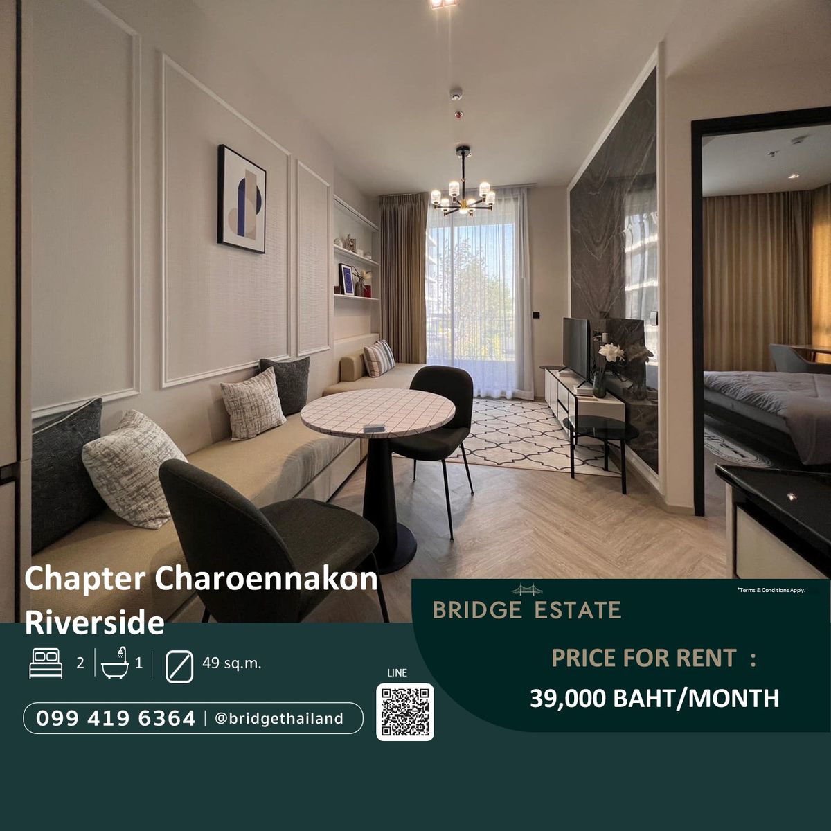 Chapter Charoennakon Riverside for Rent! River View Room details: 2 Bedrooms 1 Bathroom Size 49 SQM Fully Furnished RENT 39,000 BAHT/Month ................................. Contact agent Tell/Whatsapp