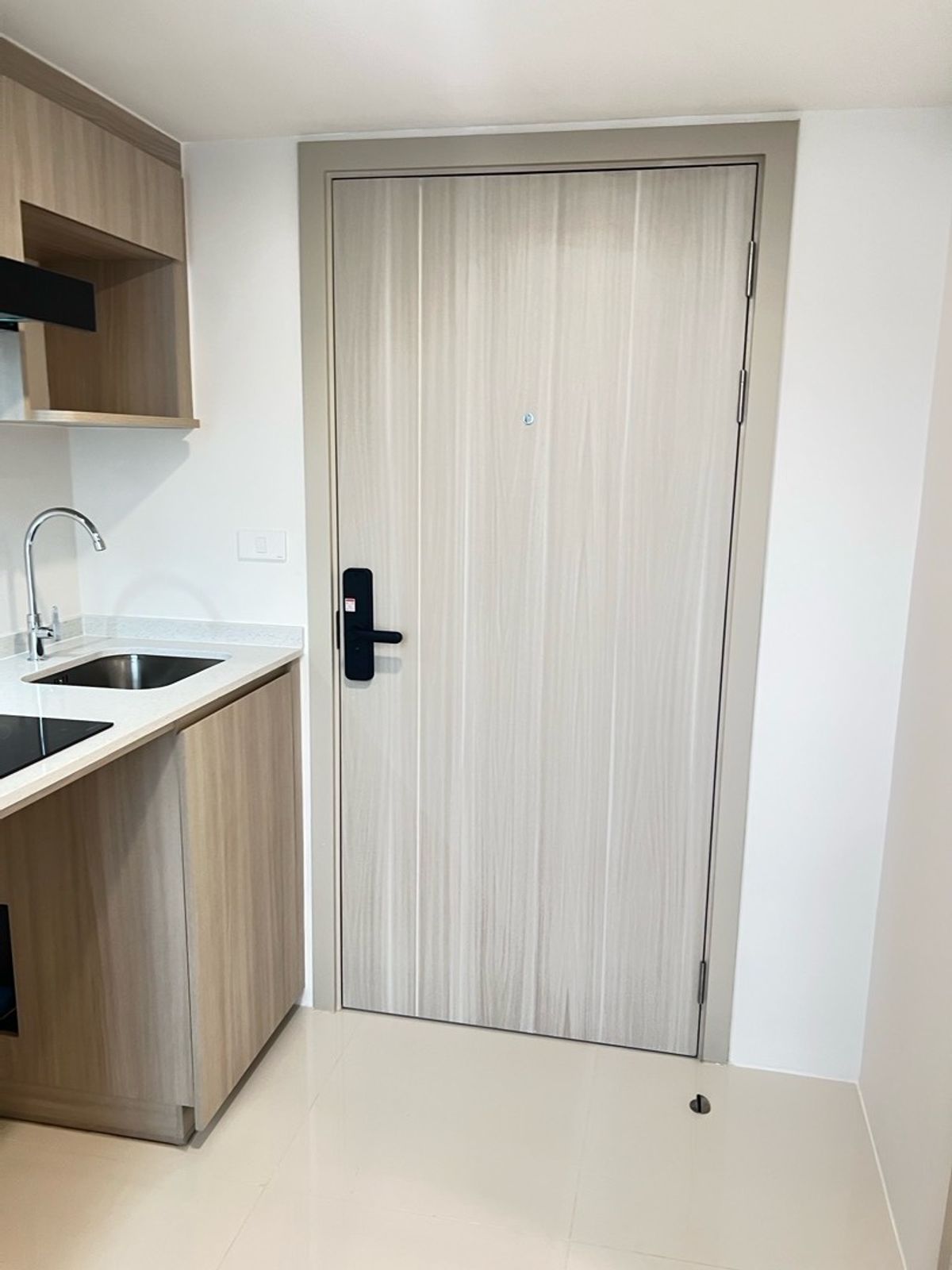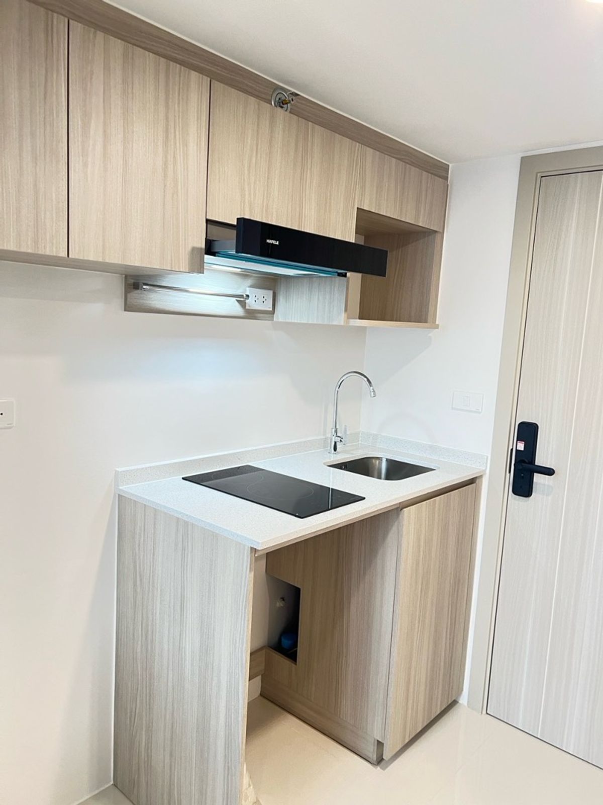 Condo for rent announcement, Origin Sai Lot project, fully furnished room, furniture + complete electrical appliances, ready to move in, pets allowed, full facilities, swimming pool, fitness center, co-working space, 24-hour security system, good location, near the BTS, shops, and amenities, rent 12,000 baht per month, minimum 2-year contract, interested contact Contact number K.Tae