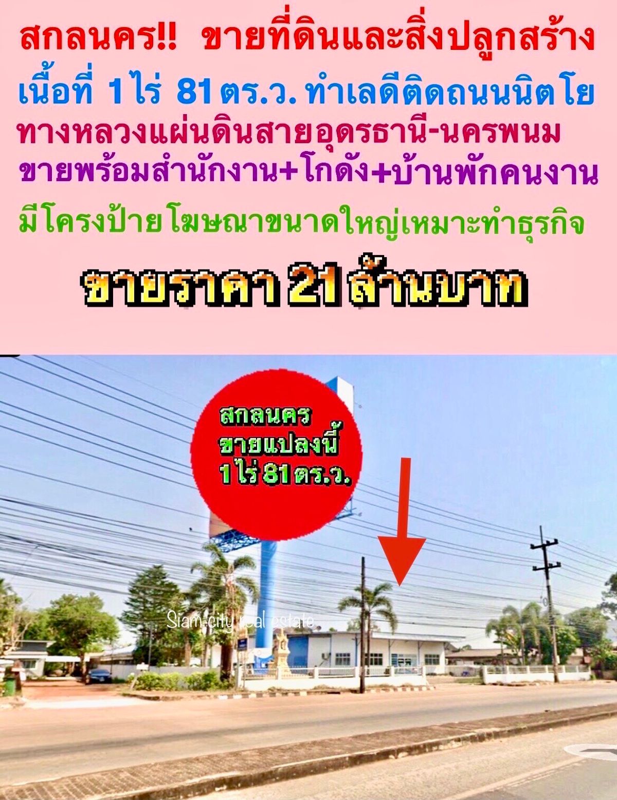 Beautiful plot of land for sale With buildings as offices and warehouses With a staff house ❣️ on the Golden Location, Nityo Road, Highway, Udon Thani-Nakhon Phanom, That Na Wen Subdistrict, Mueang District, Sakon Nakhon Province 🌈 Ready to continue business 💧 Great value at the selling price of only 21 million baht 🍄 On an area of ​​1 rai 81 sq.w. 🍄 40 meters wide, 51 meters deep 🍄 One -story concrete building 🍄 With office And warehouses 🍄 Employee home 🍄 The large billboards are clear on both sides 🍀 Suitable for 🌻 Office / Company 🌻 Warehouse warehouse / distribution center 🌻 Showroom 🌻 Buy for investment