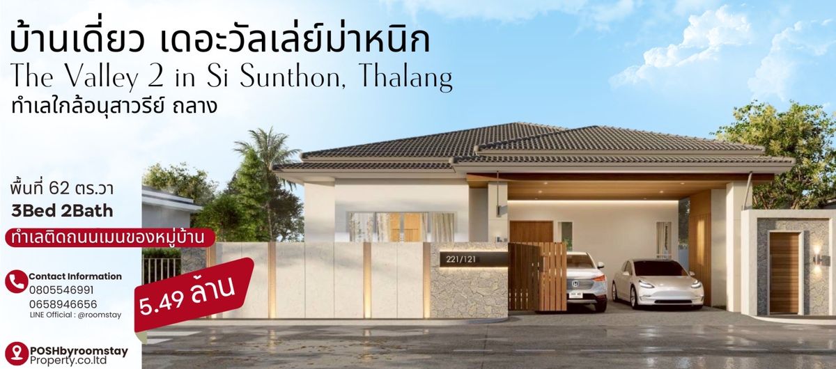 Single house, gold location In the heart of Thalang The new house, The Valley, Mika, on the main road of the village. East Good location, convenient to travel, opposite Robinson Lifestyle, near the Thao Thep-Thao Si Sunthon Home details (? 62 sq.w. • 3 bedrooms | 2 bathrooms Water pump and water tank ready to use Defined building: November 2025 Not including furniture ┏━━━━━━━━━━━━━━━━━━━━━━━┓ 💰 5,490,000 baht ┗━━━━━━━━━━━━━━━━━━━━┛ Prime details in thalang New house at the valley. Main Road. Perfectly Located Opposite Robinson Lifestyle and Near Thao Thep -THO SUNTHON MONUMENT. Property Details Landrea: 62 SQ.WAH (? Parking for 2 CARS • Kitchen with Cooker Hood and Sink • Water Pump & Water Tank Included Completion: November 2025 Unfurnished UNIT - FURNITURE NOT Included.
