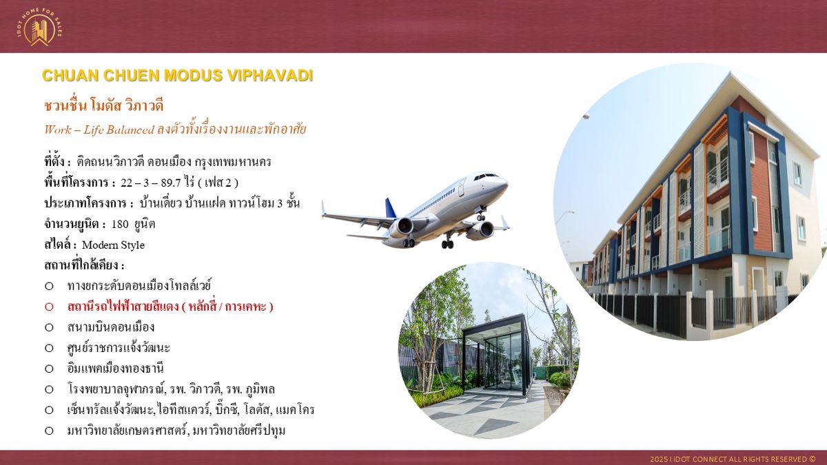 Chuan Chuen Modus Vibhavadi Selling 3 - story Town Home near SRT Station (Red Line) Laksi THB 5,690,000 3-Bed I 3-Bath I 2 Parking Lots I 197 SQM. Project Details: Chuan Modus Vibhavadi Phawadee 2 Hou