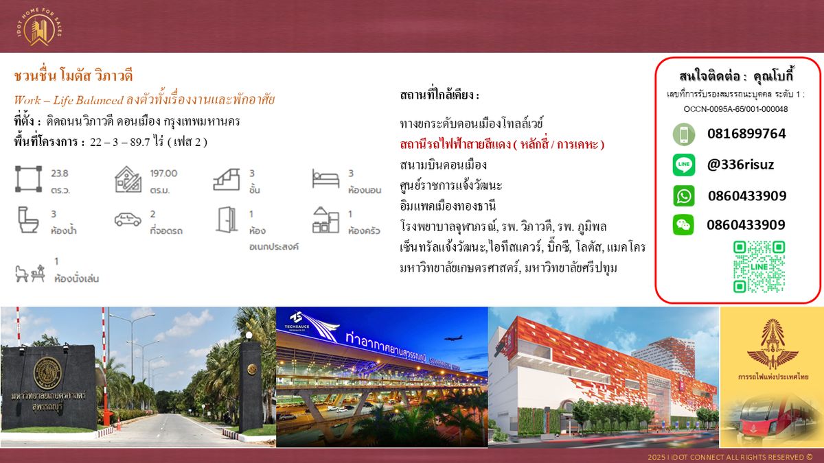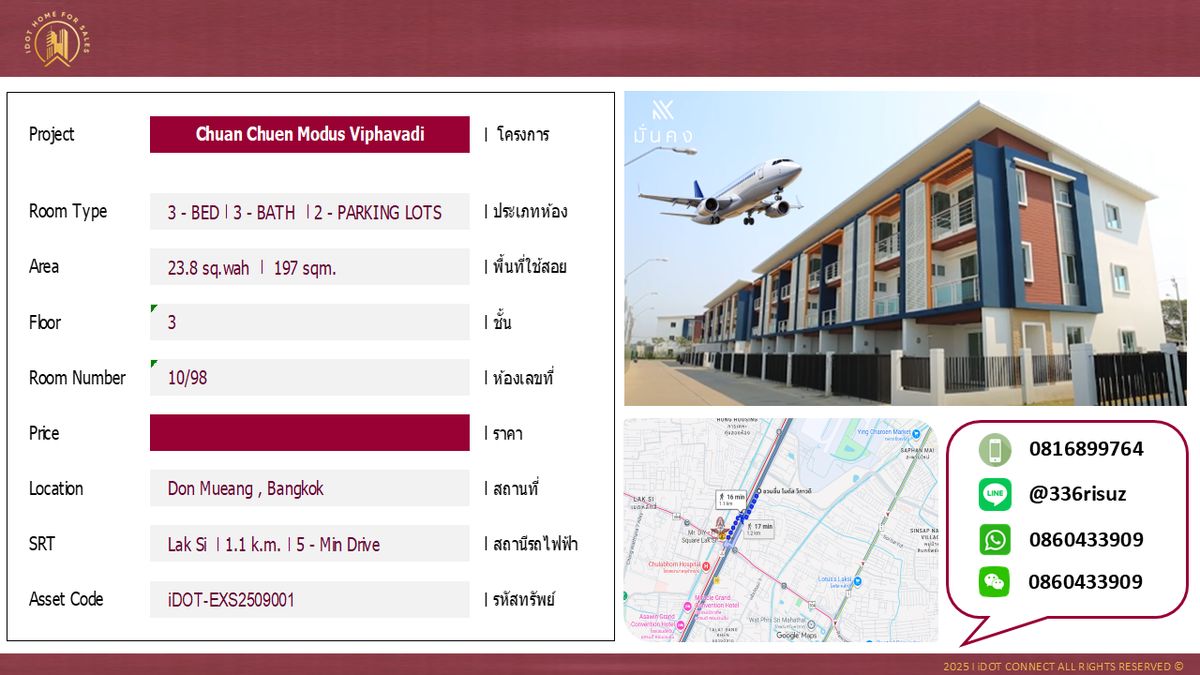 Chuan Chuen Modus Vibhavadi Selling 3 - story Town Home near SRT Station (Red Line) Laksi THB 5,690,000 3-Bed I 3-Bath I 2 Parking Lots I 197 SQM. Project Details: Chuan Modus Vibhavadi Phawadee 2 House Townhouse, Good location near Don Mueang Airport Convenient to travel Complete facilities Surrounded by green areas With a beautiful central garden The house is unique and beautiful. Ready to make the living space worthwhile So you are in a quality society that is not crowded Facilities Fitness I, Park, Image, Security System such as Key Card Access, CCTV and 24 -hour security personnel Map: Https://maps.app.goo.gl/6xqr63bnuuuhaxuo7 Nearby places: Don Mueang Tollway I SRT (Red Line) Laksi Station I Don Mueang Airport I Chaeng Watthana Government Center I Muangthong Thani I Lotus I Makro I Kasetsart University I Sripatum University I Chulabhorn Hospital I Vibhavadi Hospital I Bhumibol Hospital Contact: Bogie Contact number Line: @336risuz or click link: https://lin.ee/oukcpmm Exclusive Contract Agent (Certified by TPQI Level - 1)