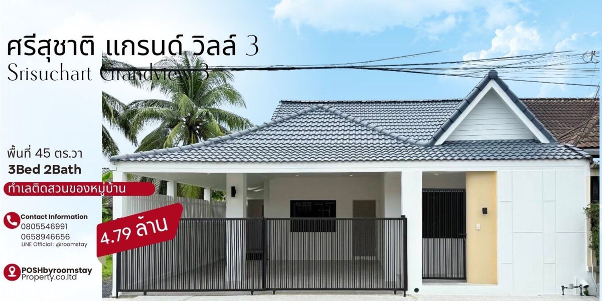 One -story twin house, the design is perfect, ready to live immediately. The atmosphere is shady, peaceful, suitable for families that need a wide space and privacy in the quality location • 1 -story twin house • 3 bedrooms, 2 bathrooms, 1 parking space • Area 45 sqw • Good location on public parks • Add a kitchen with a counter • Add a roof of the garage Special free gift • Free! Embedded gas stove + hood • Free! Water tank + water pump ┏━━━━━━━━━━━━━━━━━━━━━━━━━━┓ 💰 4,790,000 baht ┗━━━━━━━━━━━━━━━━━━━ gr Srisuchart Grand Ville 3 | Twin House Next to Village Park (? House in a Peaceful, Green Neighborhood. Fully Extended Kitchen and Carport, Ready to Move in. Perfect for Families Seeing Comfort and Privacy in a Prime Location Property Details (? Bedrooms | 2 Bathrooms | 1 Parking Space • Land Area: 45 SQ.WAH Built-in Gas Stove + Hood • Water Tank + Water Pump ⚫️ #Choan Room Stay Property 🕳️ Credit checking service • Calculate the ability to borrow • Calculate the monthly installment rate 🕳️ We Excel in Sales and ADEPTLY Manage The Trading Operations for International Client US Contact number Khun Nan Contact number Admin Contact number k.ping (ENG.) Line: @room @? PoshbyroomstayProperty.co., LTD] 📌 See beautiful house reviews via https://www.tiktok.com/@poshbyroomstay?_tog2ffg59&_r=1property for sale