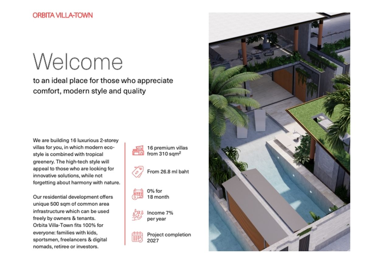 Buy with Us!! Get More Benefits!! Orbita Villa Town is the perfect pool villa project for those who value comfort, modern living, and superior quality. This exclusive development offers 16 two-storey luxury villas, blending eco-modern architecture with lush tropical greenery. Designed in a high-tech style, the villas are ideal for those who seek innovative living solutions without losing harmony with nature. The project also provides over 500 sqm of shared common facilities, available for both owners and tenants. Orbita Villa Town is suitable for families with children, athletes, freelancers, digital nomads, retirees, and investors. 📌 Project Overview Project Name: Orbita Villa Town Location: Rawai, Phuket Total Units: 16 units 🏠Unit Types & Sizes - Land Plot Size: 308 – 469 sq.m. - Living Area: 436 – 451 sq.m. - Built-up Area: 436 – 451 sq.m. 🌟 Project Highlights - Modern villas seamlessly integrated with tropical greenery - Ultimate privacy and tranquility - Just 1.8 km to Nai Harn Beach - 500 sqm of shared common area - Surrounded by Phuket’s key attractions 🏊♂️Facilities & Services - Clubhouse - Café & Lounge - 24/7 Security System & CCTV - Badminton Court - Jogging Track - Outdoor Yoga & Fitness Zone - Children’s Playground - Bicycle Rentals - Shuttle Service to Nearby Areas - EV Charging Station - Laundry Service - On-site Management Office - Two Access Entrances - 8-meter wide internal roads - Extra Guest Parking - Sun-protected outdoor areas 📌Nearby Attractions - Seafood Market: 1 km - Restaurants: 950 m - Nai Harn Beach: 1.8 km - Tops Supermarket: 950 m - Chalong Hospital: 5 km - Fitness & Muay Thai: 1.2 km - Rawai Beachfront: 950 m - Rawai Park: 650 m - Lighthouse School: 2 km - Makro: 3 km 💰Price & Investment Starting Price: THB 26.8 – 35.8 Million Who is it Perfect For? Those seeking a villa close to Phuket’s main attractions Those who desire a comfortable lifestyle with full facilities Ideal for living, investment, or rental income Exclusive Benefits When You Buy with ERA Prompt Property ✨ We are the Best-Deal Real Estate Agent in Phuket!! When buying with us, you receive more benefits than the developer provides: All property transactions handled by licensed lawyers* 1st year property insurance included Free health insurance for 1 year ** Visa application assistance ** Free participation in our rental & property management program* Free property valuation for home loans / foreigner mortgages up to 30–50% ***Terms and conditions apply*** 📲 For More Information 🌐 Website: www.promptpropertythailand.com 📞 Call: Contact number (Bangkok) | Contact number (Phuket) 💬 WhatsApp: Click Here 💚 Line@: Click Here 📧 Email: Contact email #OrbitaVillaTown #PhuketLuxuryVilla #PhuketRealEstate #PhuketProperty #LuxuryLivingPhuket #PhuketVillas #InvestInPhuket #PhuketInvestment #PropertyInvestmentThailand #HighReturnProperty #7PercentROI #SmartInvestment #PhuketLifestyle #TropicalLiving #EcoModernVilla #RawaiPhuket #NaiharnBeach #DigitalNomadPhuket #RetireInPhuket * Government taxes & fees not included ** Subject to applicant’s eligibility / not redeemable for cash *** Terms & conditions apply