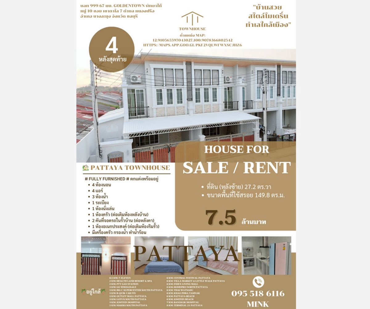 Golden Town South Pattaya-Sukhumvit Village, Townhome English-style 4 Beds 3 Baths (multiple units available) near Central Pattaya Shoping Center . Corner house in a beautiful location, sold as a pair or separately. . GOLDENTOWN Village, South Pattaya Moo 10, Soi Khao Talo 7, Khao Talo Road, Pattaya City, Bang Lamung, Chonburi 20150 GPS : https://maps.app.goo.gl/8ueUdSn6Uez52brE9 . Unit No. 999/66 , Special Price 6.5 MB ● Land (middle unit) 19 sq wah ● Usable area 117 sq m ● 4 bedrooms ● 4 air conditioners ● 3 bathrooms ● 1 balcony ● 1 living room ● 1 kitchen (extension at the back of the house) ● 2-car parking under the fence (with roof extension) ● Kitchen appliances, water filter, and hot water supply are included. ● FULLY Furnished # Fully Furnished, Ready to Move In ● 12. Contact number, 100. Contact numberhttps://maps.app.goo.gl/96E4fy6Cnt7Lud2QA . Unit No. 999/67, Special Price 7.5 MB ● Land (left side) 27.2 sq wah ● Usable Area 149.8 sq m ● Fully Furnished # Fully Furnished, Ready to Move In ● 4 Bedrooms ● 4 Air Conditioners ● 3 Bathrooms ● 1 Balcony ● 1 Living Room ● 1 Kitchen (Backyard Extension) ● 2-Car Parking Space (Undercover) ● 1 Multipurpose Room (Additional room along the fence) ● Kitchen appliances, water filter, and hot water heater included. ● 12. Contact number, 100. Contact numberhttps://maps.app.goo.gl/UijAEZccpehQAX1P6 . Nearby landmarks : ● 0.5 KM : 7-ELEVEN ● 2 KM : HEALTH LAND RESORT & SPA ● 2 KM : PTT GAS STATION ● 3 KM : GO WHOLESALE ● 3 KM : BIG C SUPERCENTER SOUTH PATTAYA ● 3 KM : B-QUIK CAR FIX ● 3 KM : OUTLET MALL PATTAYA ● 3 KM : LOTUS SOUTH PATTAYA ● 3 KM : JOMTEIN HOSPITAL ● 5 KM : MAKRO SOUTH PATTAYA ● 6 KM : CENTRAL FESTIVAL PATTAYA ● 6 KM : VILLA MARKET @ LITTLE WALK PATTAYA ● 6 KM : INDEX LIVING MALL ● 6 KM : HOMEPRO NORTH PATTAYA ● 6 KM : THAI WATSADU ● 6 KM : KHAO PHRA TAMNAK ● 6 KM : PATTAYA BEACH ● 6 KM : JOMTEIN BEACH ● 7 KM : BANGKOK HOSPITAL ● 8 KM : TERMINAL 21 PATTAYA . If you are interested, please contact : Khun Ming Call : Contact number Line ID : minkdd