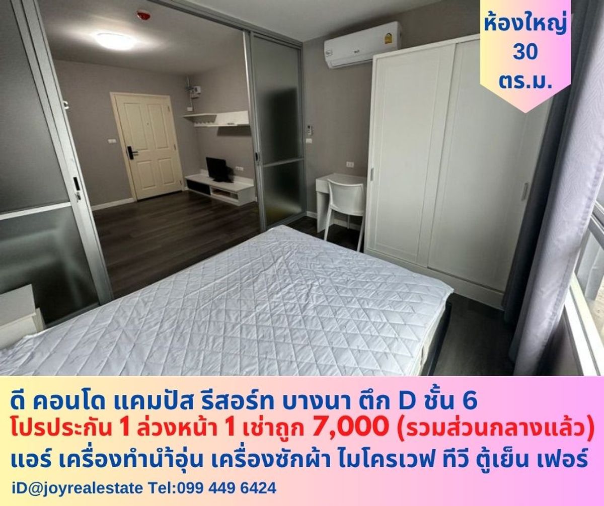 📌 Condo for rent, D -Condo Campus Resort, Bangna, Building D 6, Prote 1 in advance 1 rental 7,000 baht 📌1 1 bedroom, 1 kitchen, 1 bathroom, 30 sqm. 📌 Free service for condo rooms -air conditioner -Water heater -Washing machine -Microwave -Refrigerator -TV 📌 Furniture -Multipurpose table set with 2 sets of chairs -Bed with mattress -Central table -TV shelf -wardrobe -Curtain -Sofa 📌 Facilities -Garden -Fitness and swimming pool -24-hour security officers 📌 Nearby locations -ABAC University, Bangna -Welout Industrial Estate () 📌 Special promotion 1 in advance 1 ready for 7,000 baht Rental 7,000 baht/month (Included the central value) Joy ☎️ Contact number🆔@Joyrealestate Selling/rental Real estate Joy Real Estate