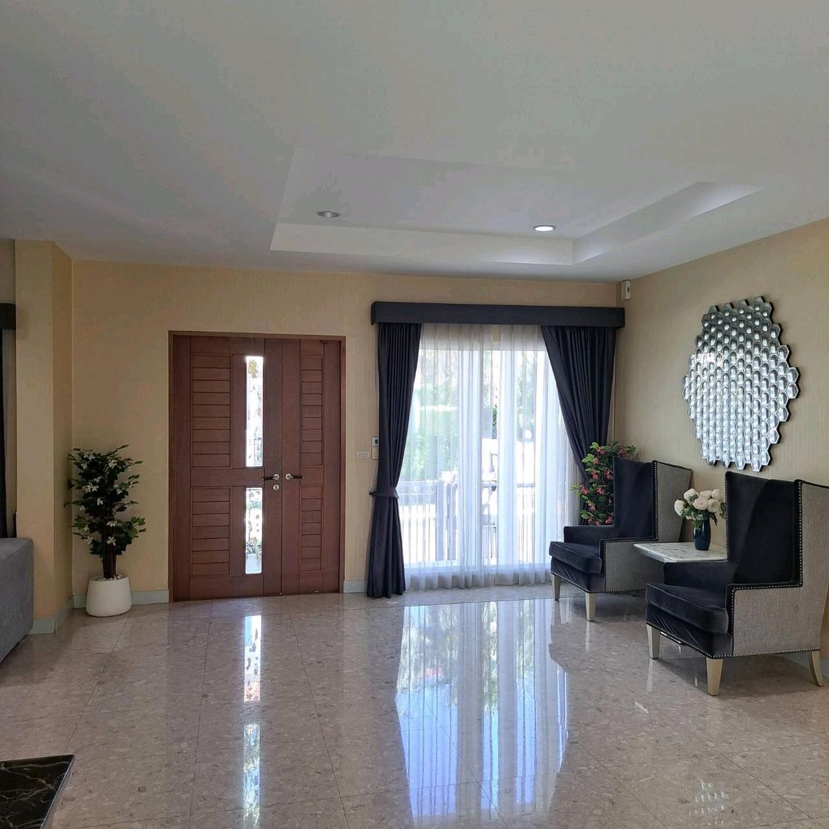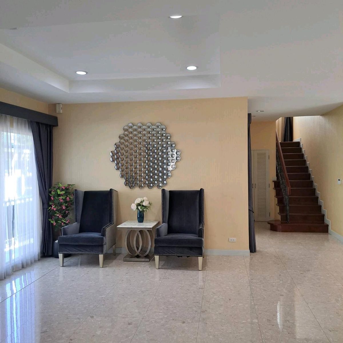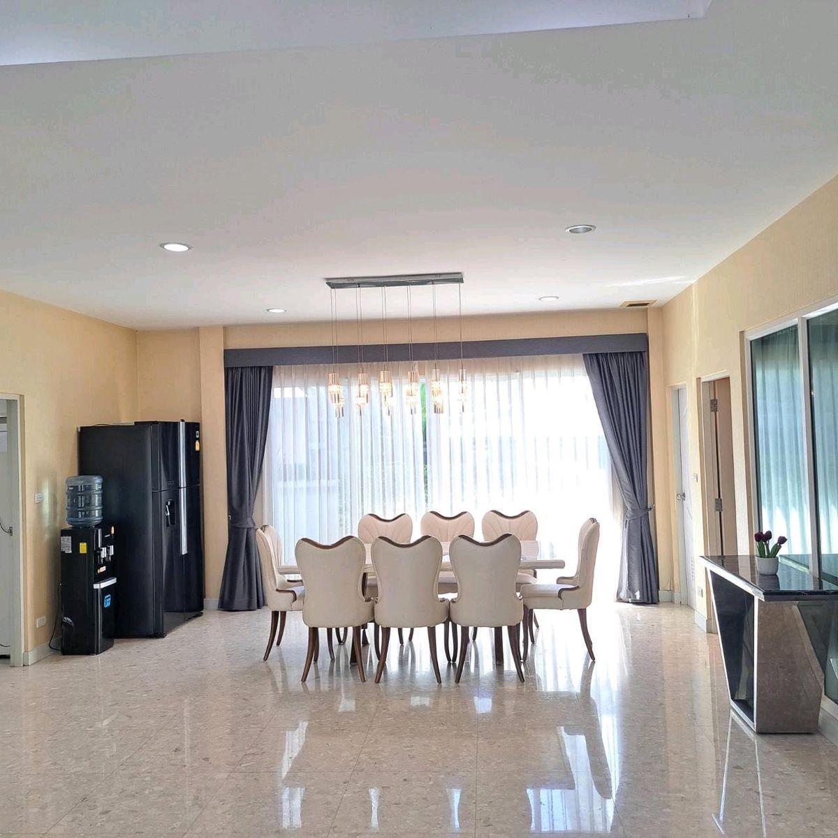 Grand Bangkok Boulevard Rama Project 9-Srinakarin, Krungthep Krita Road 2-storey house, high level safety - Size 75 square wah, living area 335 square meters - 2-level security door - 5 bathrooms - 1 living room - Double Living Room - 1 Dining Room (? 1 Kitchen (? The housekeeper room has an ensuite bathroom - 2 Parking Full furniture. Ready to live - Electrical appliances - 6 air conditioners - Automatic washing machine - Large refrigerator - Electric stove
