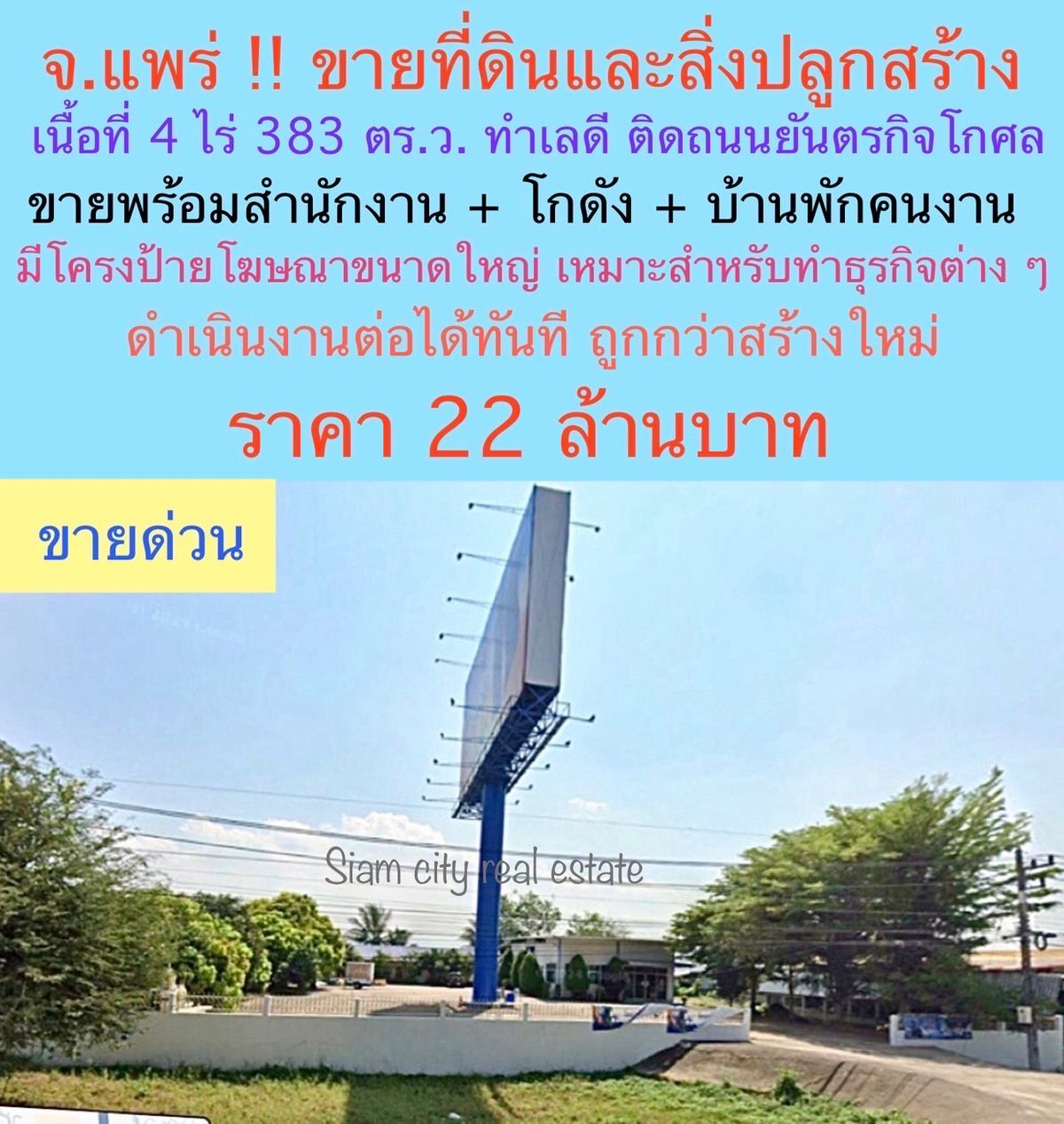 Beautiful plot of land for sale With buildings as an office with warehouses And the staff house ✳️ Ready to continue the business Cheaper than the new creation 🌅 On the golden location on the road, Kosol Kosol Road, Hua Fai Subdistrict, Sung Men District, Phrae Province Great value ❗️ at a price of 22 million baht 🏁 Land size 4 rai 383 sq.w. The width of the road is 110 meters in the road 73 meters 🏁 One -story concrete 🏁 Building size 10 meters x 25 meters 🏁 Building area 260 sq.m. 🏁 Advertising signs on both sides, size 10 meters x 20 meters 🏁 Staff house ❣️ Suitable for 🪁 Make office / company 🪁 Warehouse / warehouse 🪁 Showroom 🪁 Gas station 🪁 Buy for investment ☎️ Interested, please contact Khun Sutthip Tel/LINE Contact number