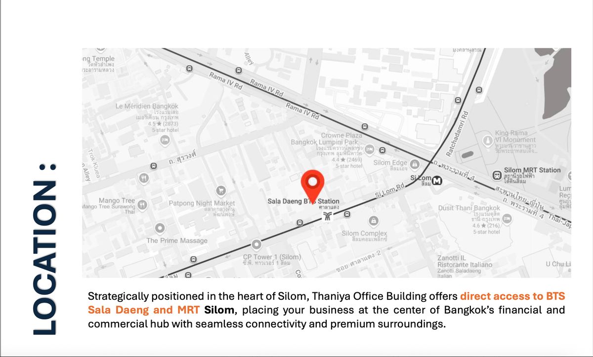 Rent Offce Space connect bts Saladaeng MRT Silom Office for rent, next to BTS Sala Daeng and MRT Silom. Thaniya Tower B, 10th floor, 93.48 sq m. Excellent accessibility, with direct BTS access. Spilt