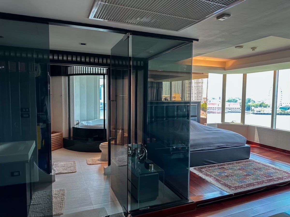 This unit for sale at Watermark Chaopraya River is located on the 9th floor of Tower A, offering an expansive space of 242 sq.m. It features 2 bedrooms, 4 bathrooms, a spacious living area, a separate kitchen, a laundry room, and a maid’s room. Ideal for families seeking generous living space, the unit also enjoys a scenic view toward the Bangkok Bridge. Watermark Chaopraya River provides a full range of facilities, including a swimming pool, fitness center, sauna, tennis court, riverside common areas, and 24-hour security. The project offers privacy, comfort, and a peaceful environment along the Chao Phraya River. The development is ideally located by the river, near the Bangkok Bridge, with convenient access to the city via main roads and expressways. It is surrounded by shopping centers and other urban conveniences.