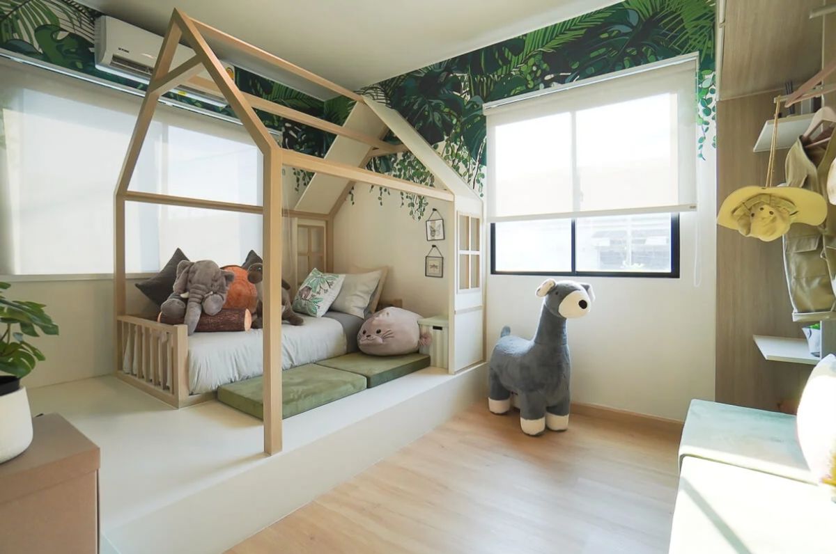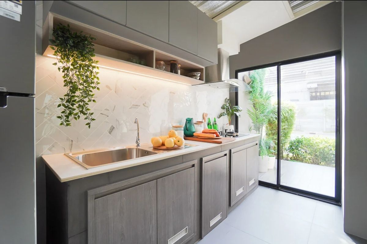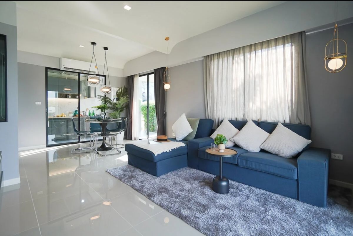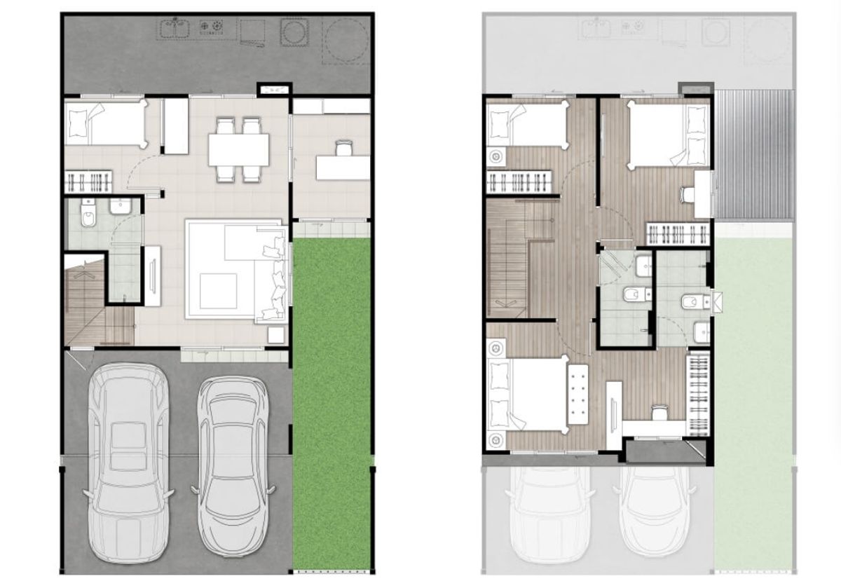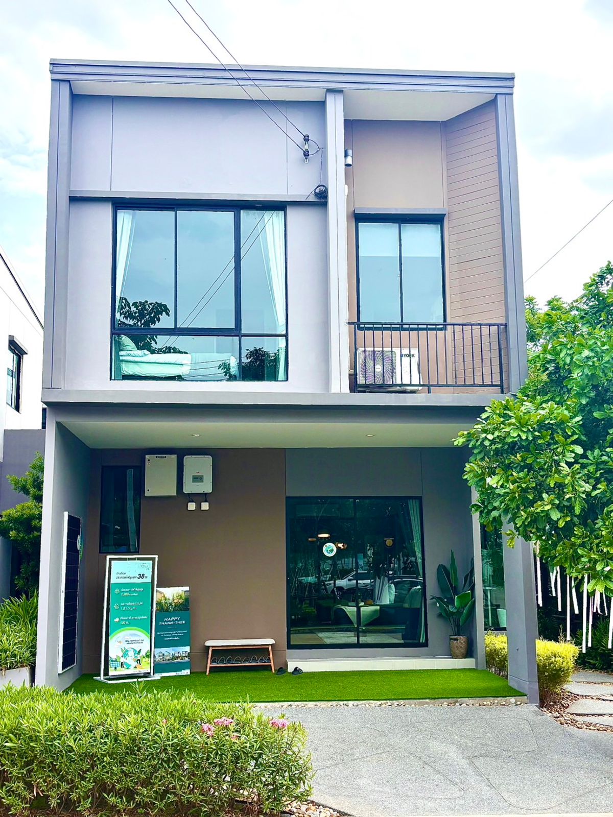 House style THEE+  The front of the house is 7.7 meters wide  Single house function  5 bedrooms  3 bathrooms  Parking for 2 cars in the house Free style house The houses are not attached to each other.  Install solar. During the day, use electricity for free and sell electricity back to the government Large 2-story clubhouse, fitness center, swimming pool, co-working space, reception lobby.