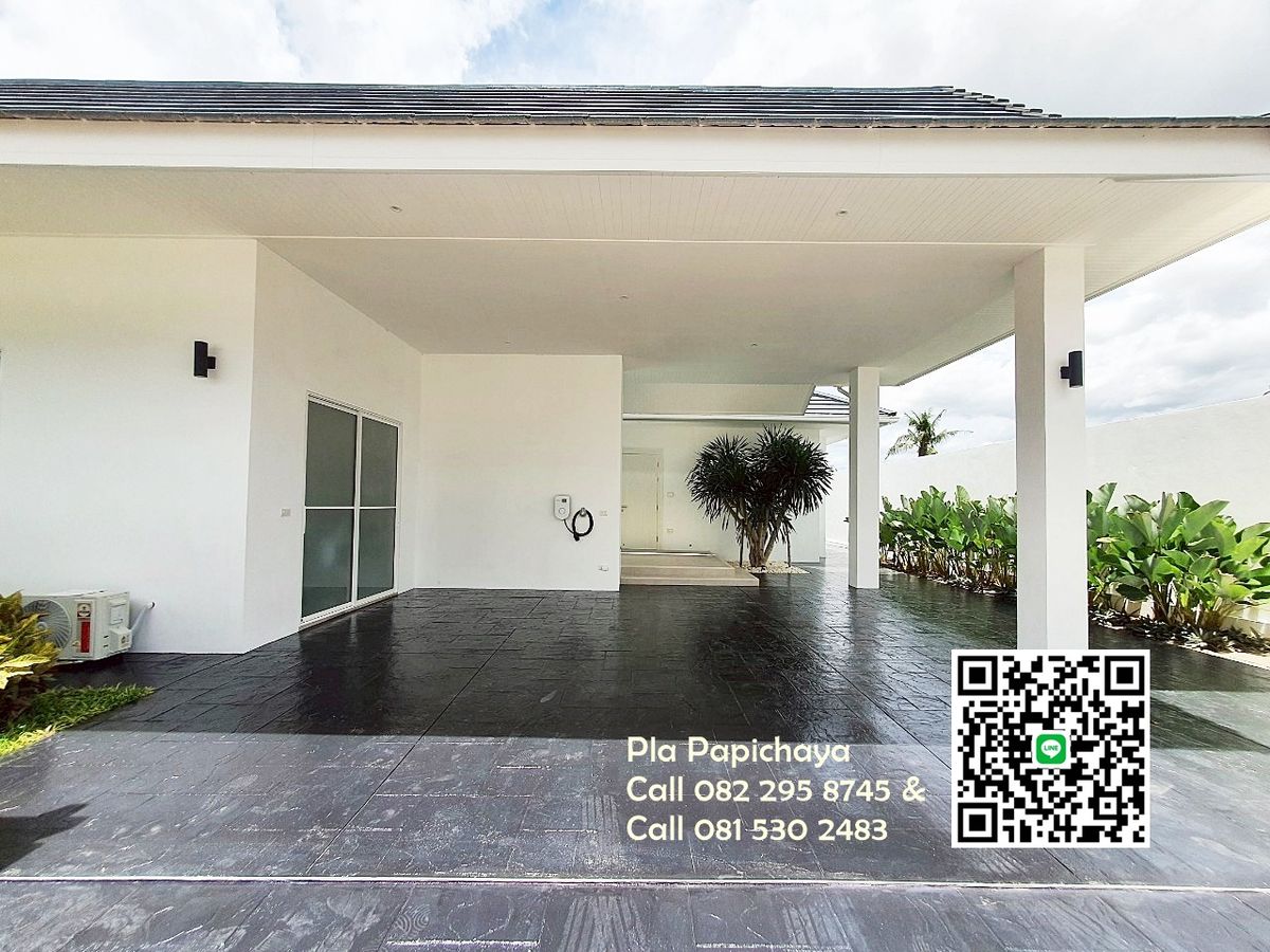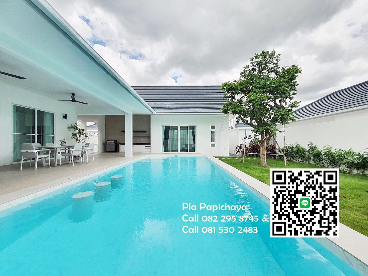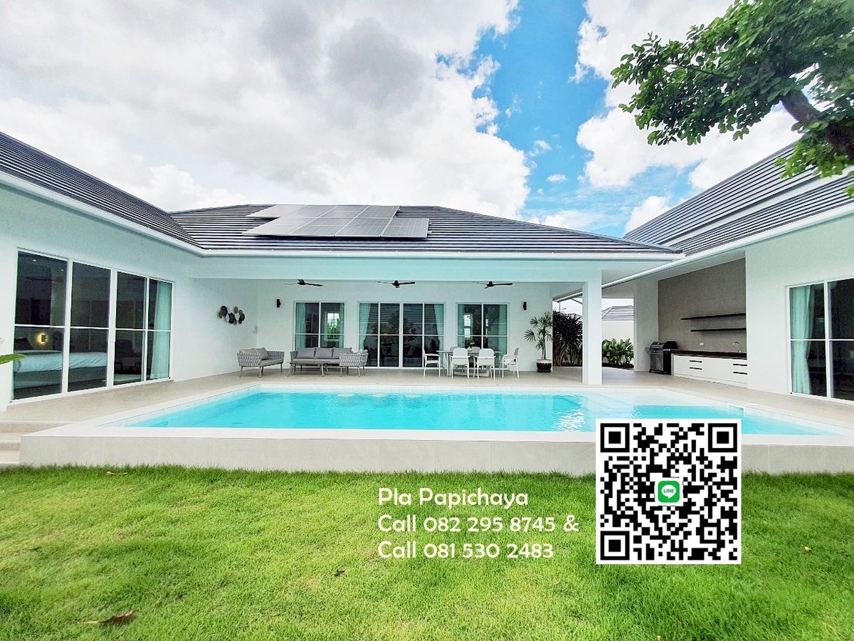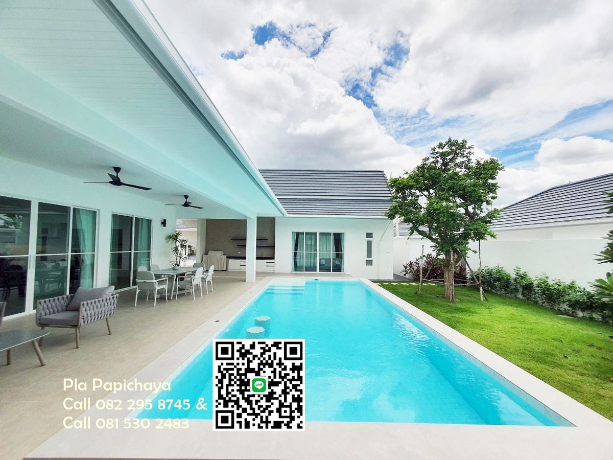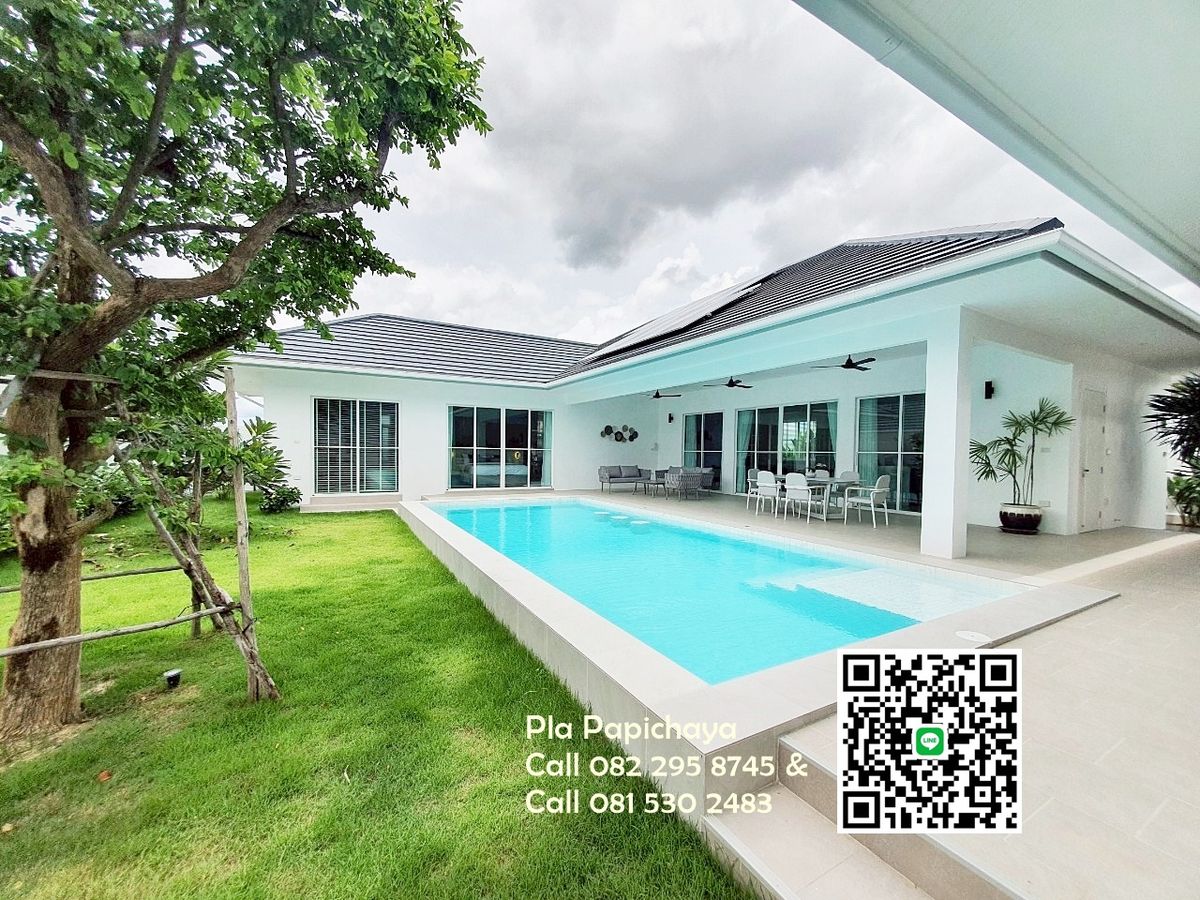 House with private pool Huahin Sell price 11,454,500 baht 3 bedrooms 3.5 bathrooms Land area 150 sq.wah ( 600 sq.m) Living area 241 sq.m Main house come with 2 bedrooms 2.5 bathrooms, washing room, full equipped kitchen and living room. Small house is with 1 bedroom 1 bathroom and BBQ area at front of house. These two houses are connected to each others by swimming pool, garden and large terrace. Car park two cars. Build in furniture, Solar panel 10 KW and EV charger 7kW/32A Transfer fee 50/50. Common fee is 5 baht per sq.m/month. Community facilities : security , garbage collection, public garden, Gym (upon complete) There are 33 houses at this community. It is 25 minutes between house and HuaHin, near SamPanNam Floating market and 30 minutes to the beach. For more detail & visit : Pla Papichaya Call & whatsapp Contact number Call Contact number Email : Contact email