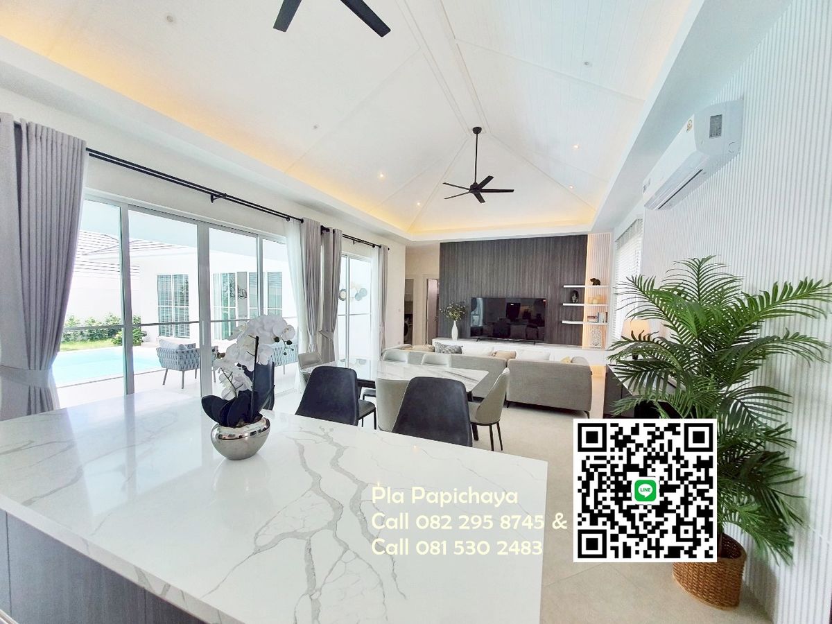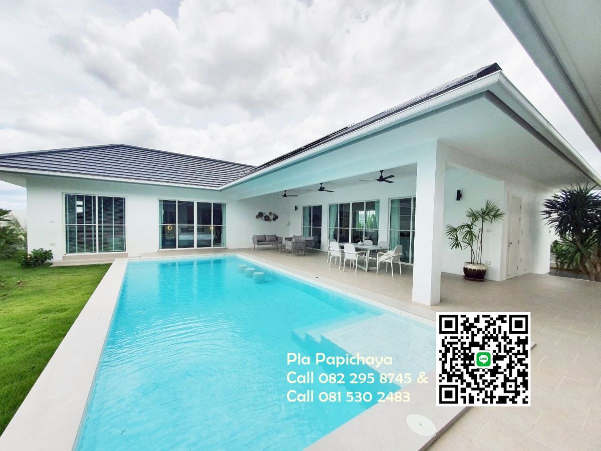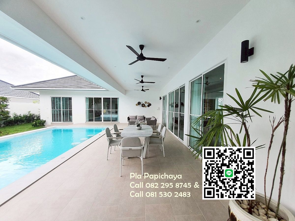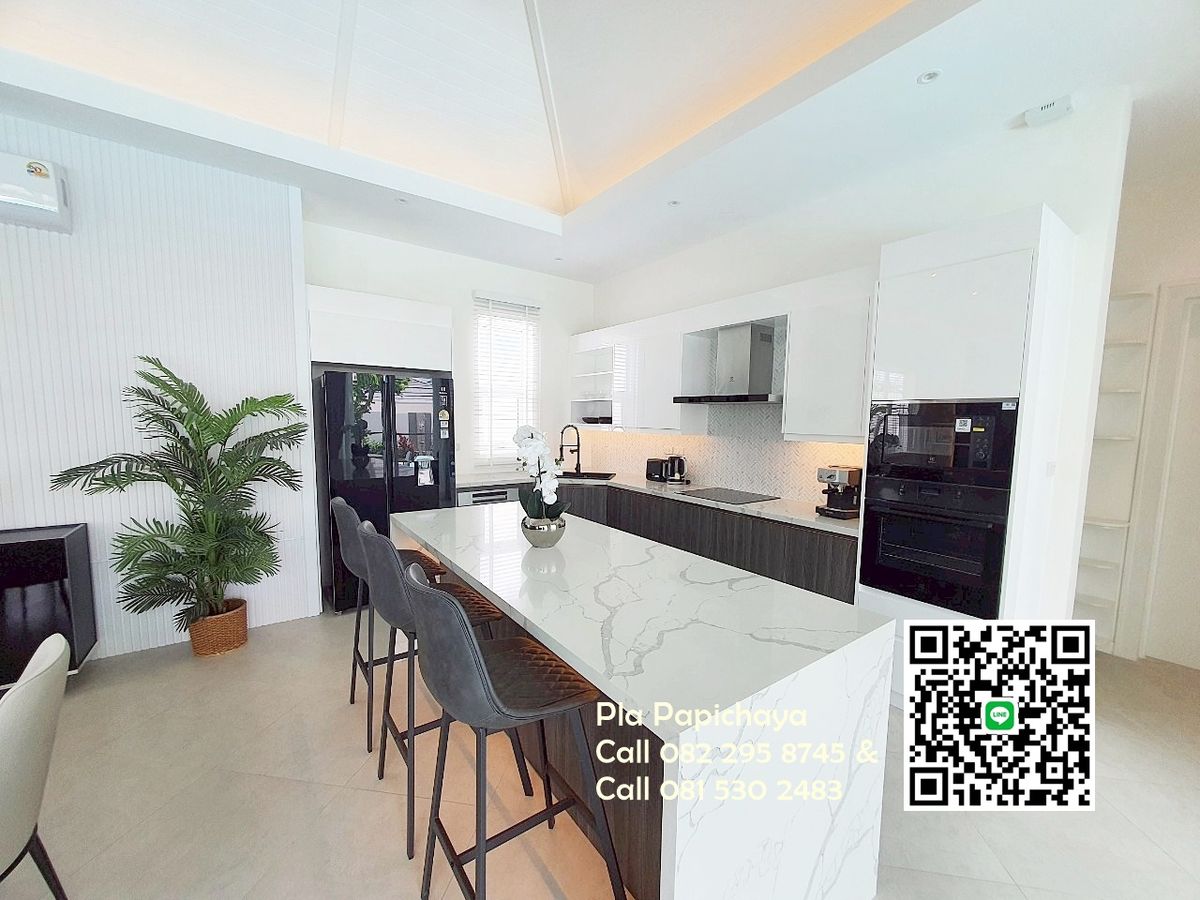 House with private pool Huahin Sell price 11,454,500 baht 3 bedrooms 3.5 bathrooms Land area 150 sq.wah ( 600 sq.m) Living area 241 sq.m Main house come with 2 bedrooms 2.5 bathrooms, washing room, full equipped kitchen and living room. Small house is with 1 bedroom 1 bathroom and BBQ area at front of house. These two houses are connected to each others by swimming pool, garden and large terrace. Car park two cars. Build in furniture, Solar panel 10 KW and EV charger 7kW/32A Transfer fee 50/50. Common fee is 5 baht per sq.m/month. Community facilities : security , garbage collection, public garden, Gym (upon complete) There are 33 houses at this community. It is 25 minutes between house and HuaHin, near SamPanNam Floating market and 30 minutes to the beach. For more detail & visit : Pla Papichaya Call & whatsapp Contact number Call Contact number Email : Contact email