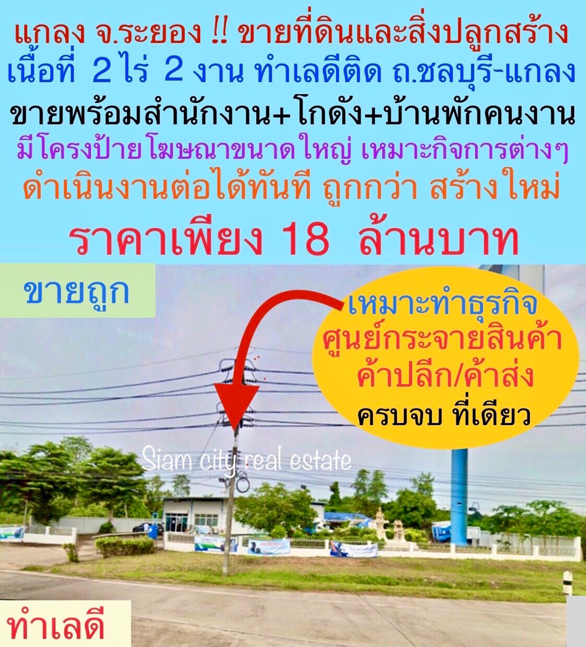 Land and buildings for sale as offices and warehouses. With staff housing 🏡 in a good location next to Chonburi - Klaeng Road, Thang Kwian Subdistrict, Klaeng District, Rayong Province 🍄 Ready to continue operating. Cheaper than building a new one 🌿 Selling for 18 million baht 💥 Land size 2 rai 2 ngan 💥 One-story concrete building 💥 Building size 10 meters x 50 meters 💥 Building area 335 sq m 💥 Employee housing 💥 Advertising sign, visible on both sides, size 10 m x 20 meters 🌈 Suitable for 🪁 Doing various businesses, retail and wholesale 🪁 Car repair shop 🪁 Make it an office / company 🪁 Warehouse / Warehouse 🪁 Showroom 🪁 Buy for investment ☎️ If interested, contact Mr. Suthatip Tel./Line Contact number