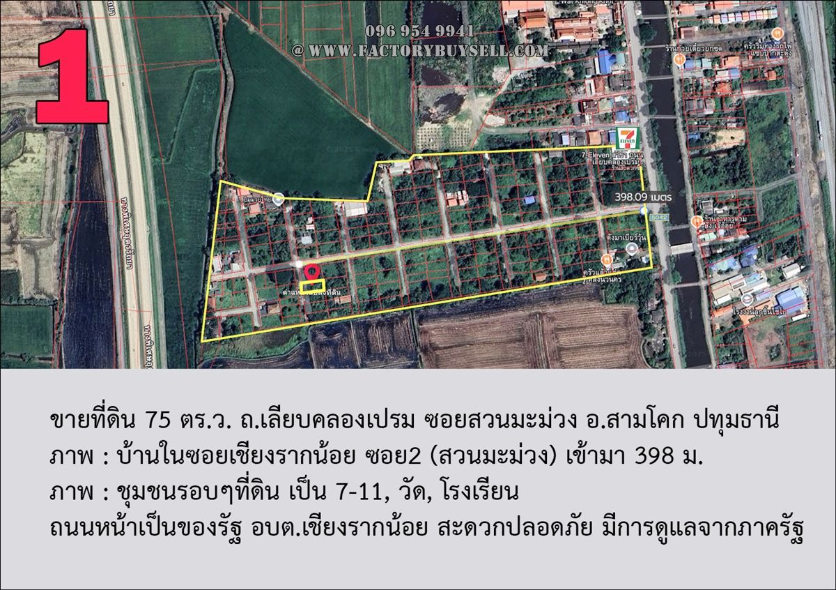 🏡 Land is out of reservation! 75 sq m, Sam Khok, Pathum Thani The owner is re-letting it at a special price of 580,000 baht only ✅ Title deed ready for transfer ✅ Good location, not deep into the alley ✅ The buyer pays the transfer fee of 15,000 baht Who missed the previous round? Dont delay this time. Call Contact number 🏡 Beautiful land, already filled in, ready to build a house 🔖 Price 800,000 baht (before discount) 📌 Chiang Rak Noi Road, Soi 2 (Soi Suan Mamuang), Sam Khok, Pathum Thani 🌿 Peaceful, shady location, suitable for building a house for quality of life 🌳 Open view, resort atmosphere, close to the city, convenient travel 🏘️ Special plot, quiet zone, surrounded by houses, not lonely🛣️ Wide public road, peaceful but not far from the community 📍 Near important places: ▫️ Thammasat University, Rangsit ▫️ Bang Pa-in–Pak Kret Expressway (Just a few minutes) ▫️ Flash Express, Nava Nakhon Train Station ▫️ Saphan Khao Market, Sala Pan School ▫️ 7-Eleven in front of the project ✨ Simple but premium life — starts here 📞 Call Contact number or add Line to see the actual plot https://www.factorybuysell.com/product/172/ขายที่ดิน-เลียบคลองเปรม-สามโคก-ปทุมธานี