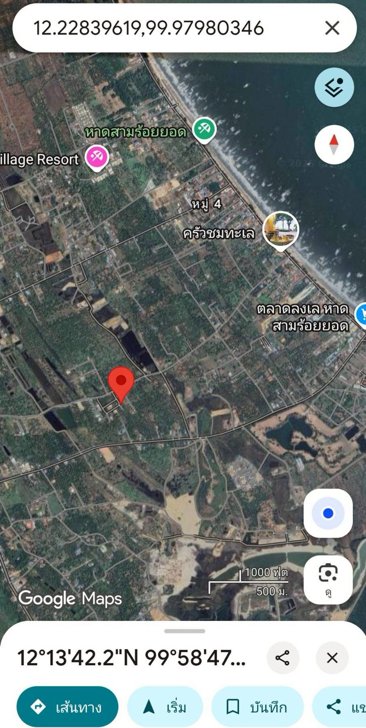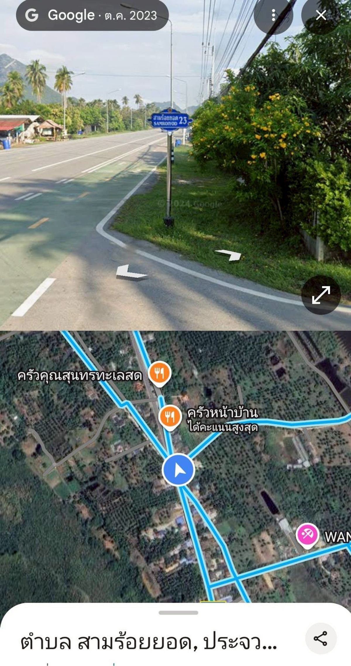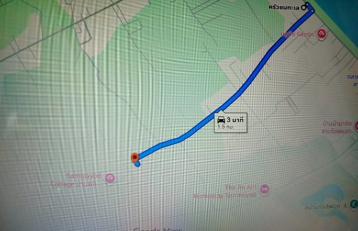 Land for sale, 50 sq m, near Sam Roi Yot Beach, 1.4 kilometers, in front of the beach, alley near Krua Chom Talay. If you enter the other way, you will enter Soi Sam Roi Yot 23, near 7-11 Phu Noi, 1.8