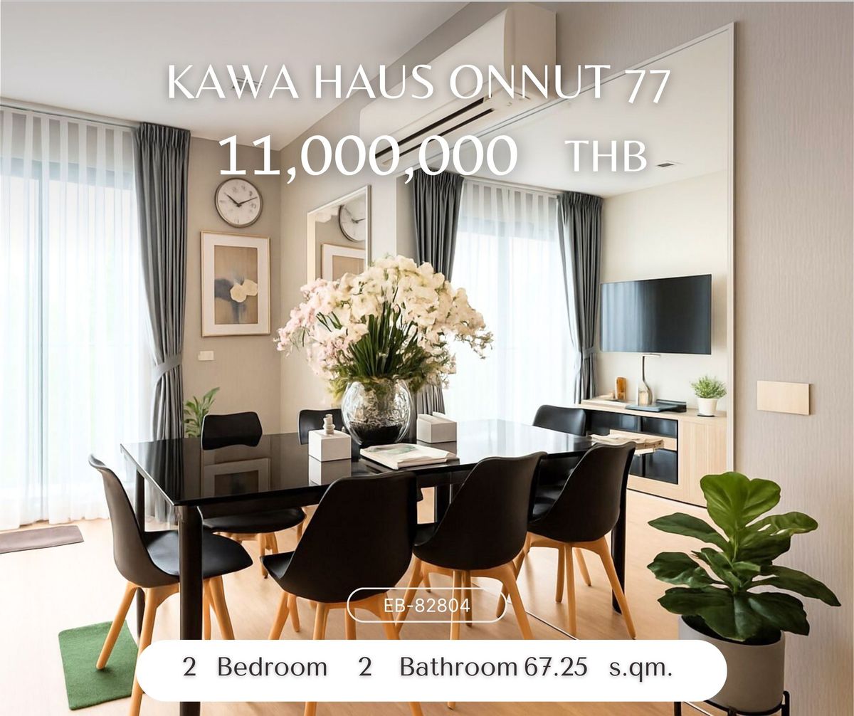 Kawa Haus, Onnut 77 (ID: EB-82804TP) 📍 Location: Onnut 77, T77 Community 🚆 BTS: On Nut 🏢 Building: Kawa Haus by Sansiri 🏠 Type: 2 Bedrooms / 2 Bathrooms 📏 Size: 67.25 sqm 💰 For Rent: 45,000 THB / month 📄 For Sale: 11,000,000 THB 📞 For more information & viewing: Call/Line: Contact number (Fern) ✨ Highlights: Modern 2-bedroom condo with 67 sqm of bright, open living space Located in Sansiri’s T77 community — peaceful, green, and well-managed Beautifully furnished with warm tones and quality materials Resort-style facilities: pool, gym, co-working lounge, and garden spaces Easy access to BTS On Nut with shuttle service provided Surrounded by cafes, restaurants, and lifestyle malls — perfect for urban living 🛍 Nearby Shopping & Lifestyle: Habito Mall, Big C Onnut, Lotus Onnut, Century Mall, Pickadaily Bangkok 🎓 Nearby Schools: Bangkok Prep International School, Wells International School, Anglo Singapore International School, St. Andrews International School, Charter International School