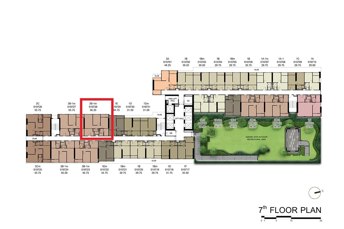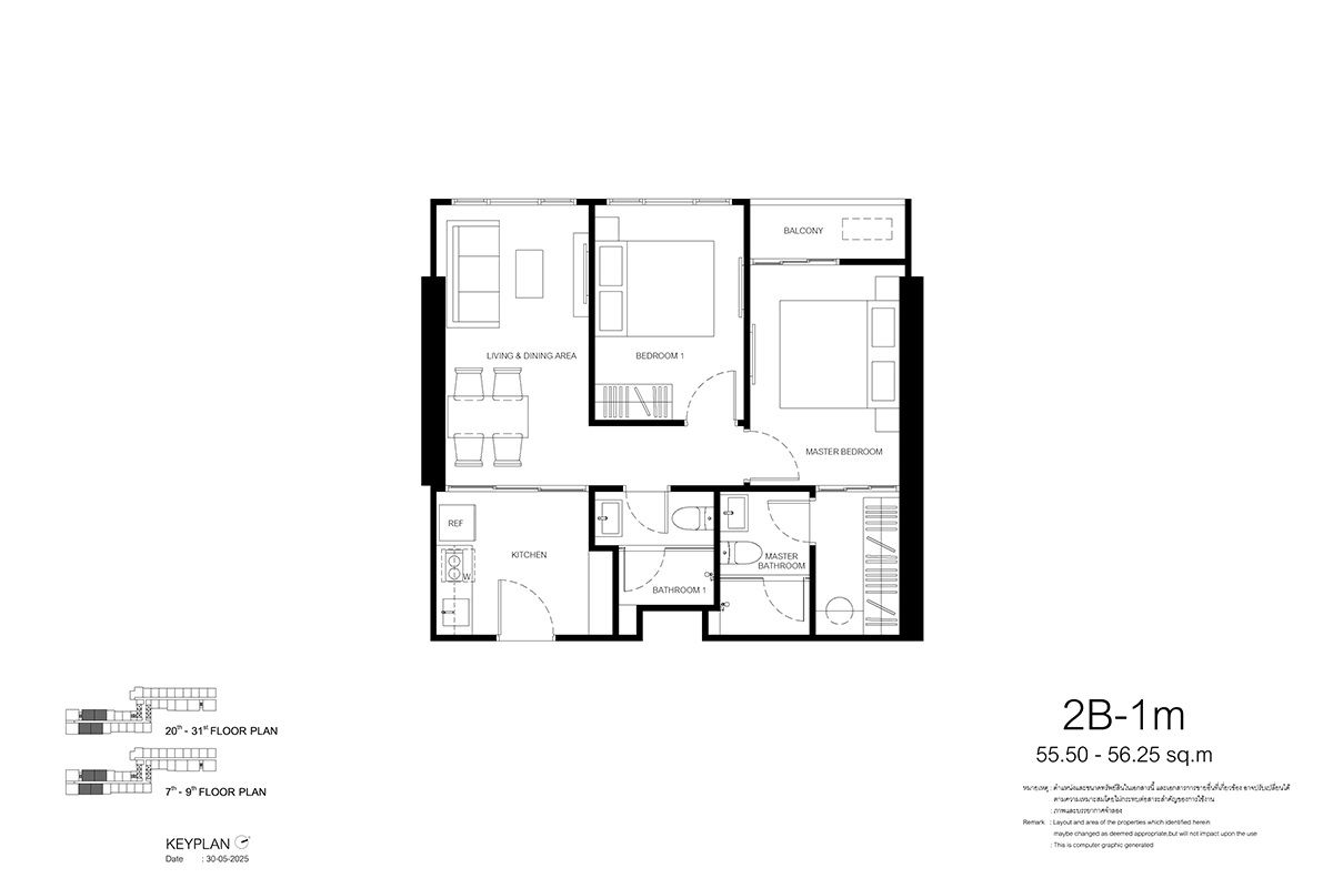 010728 7th floor, position 28 2 bedrooms, 2 bathrooms, size 56.25 sq m is a wide front room, closed kitchen, every room is separated from each other by a solid wall there is a walk in closet in the Ma