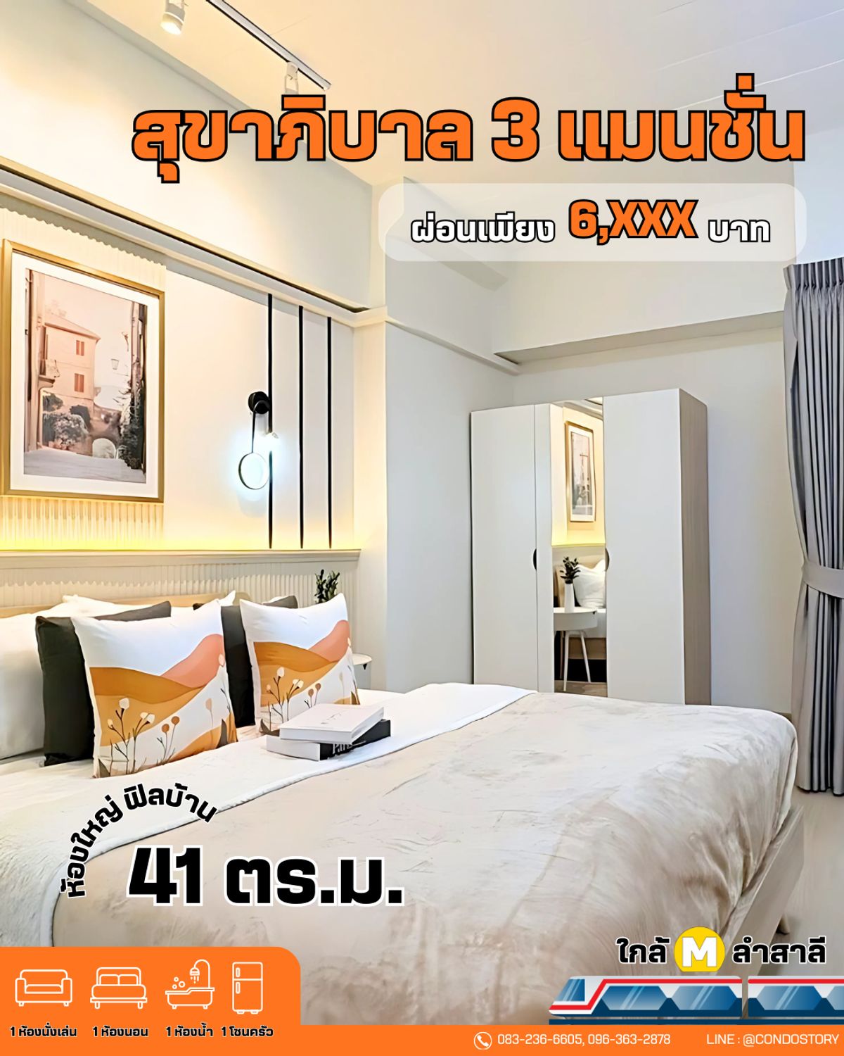 Sukhapiban 3 Mansion 🏡Large room, home feel, 41 sq m., easy walk to MRT Lam Sali Location https://maps.app.goo.gl/b8d87Am1NKQBukt38 🏢 Size 41 sq m., spacious. Comfortable to live in 🛋️ Complete functions, divide the room into proportions. Convenient to use 🌆 Open view, airy, not uncomfortable [Free!! Furniture and electrical appliances] ✓ Air conditioner ✓ Water heater ✓ 5 foot bed with mattress ✓ Wardrobe ✓ 2-layer UV protection curtain ✓ Sofa, carpet ✓ TV shelf ✓ Waterproof rubber tile floor Highlights of the project: 🚗 There is parking, no need to search tiring 🛡️ 24 hour security guard with key card system ✓ Security guard / cctv ✓ Digital door, fingerprint scanner Very good location : 🚆 Near MRT Lam Sali. You can walk to the train! ⛵ Near Wat Si Bunrueang Pier Taking a boat into the city is very convenient 📍 The Mall Bangkapi & Pantip Bangkapi, easy to shop, convenient to travel 📍 Ramkhamhaeng Hospital, peace of mind, close to the doctors hand 📍 Bang Kapi Market, lots of food. Whenever youre hungry, theres something to choose from.