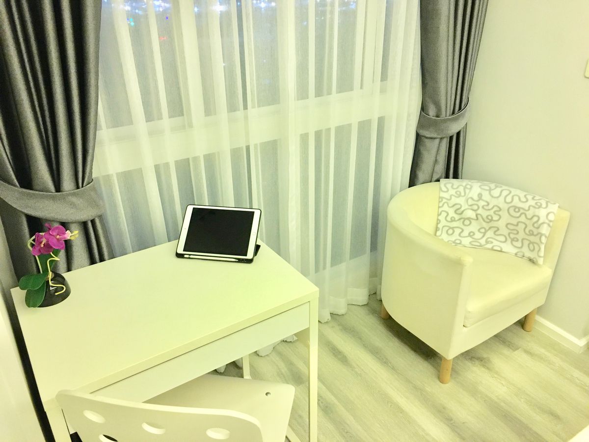 Modern studio, tranquil room on the top floor right at the heart of Muang Thong Thani (IMPACT exhibition centre). Free monthly cleaning service from professional cleaners Walking distance to skytrain station: Pink line Fully furnished: Fridge-freezer, washing machine, microwave, Double bed, Air condition, Built-in Wardrobe and storage, Desks, heated shower, small couch, high quality blackout curtains. (Happy to provide if need more amenities.) Facilities: Swimming pool, Gym, Garden, 24/7 securities and CCTV, Free parking space (100%) Ideal location for IMPACT Arena & Exhibition hall, Cosmo Bazaar, Kasikorn Bank, Go-kart racing track, etc. 30 mins from DMK international airport. Contact: lineID ra88999 Link to Attractions: Cosmo Bazaar http://www.cosmobazaar.biz/en/surrounding Impact Arena Exhibition and Convention Center ****No pet please & For non-smokers & Professionals only