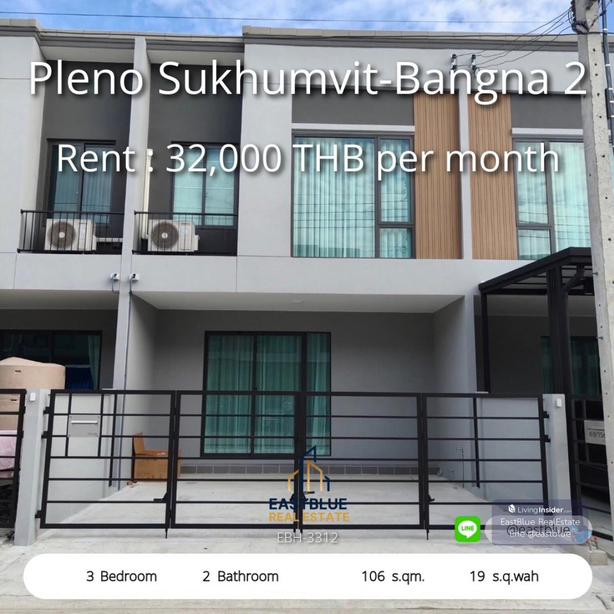 Project : Pleno Sukhumvit-Bangna 2 ID : EBH-3312 3 Bed 2 Baht House Area :106 sqm Land Area :19 sq.wah Rental Price : 32,000 THB per month Selling Price : THB . Contact, Appointment for viewing. call: