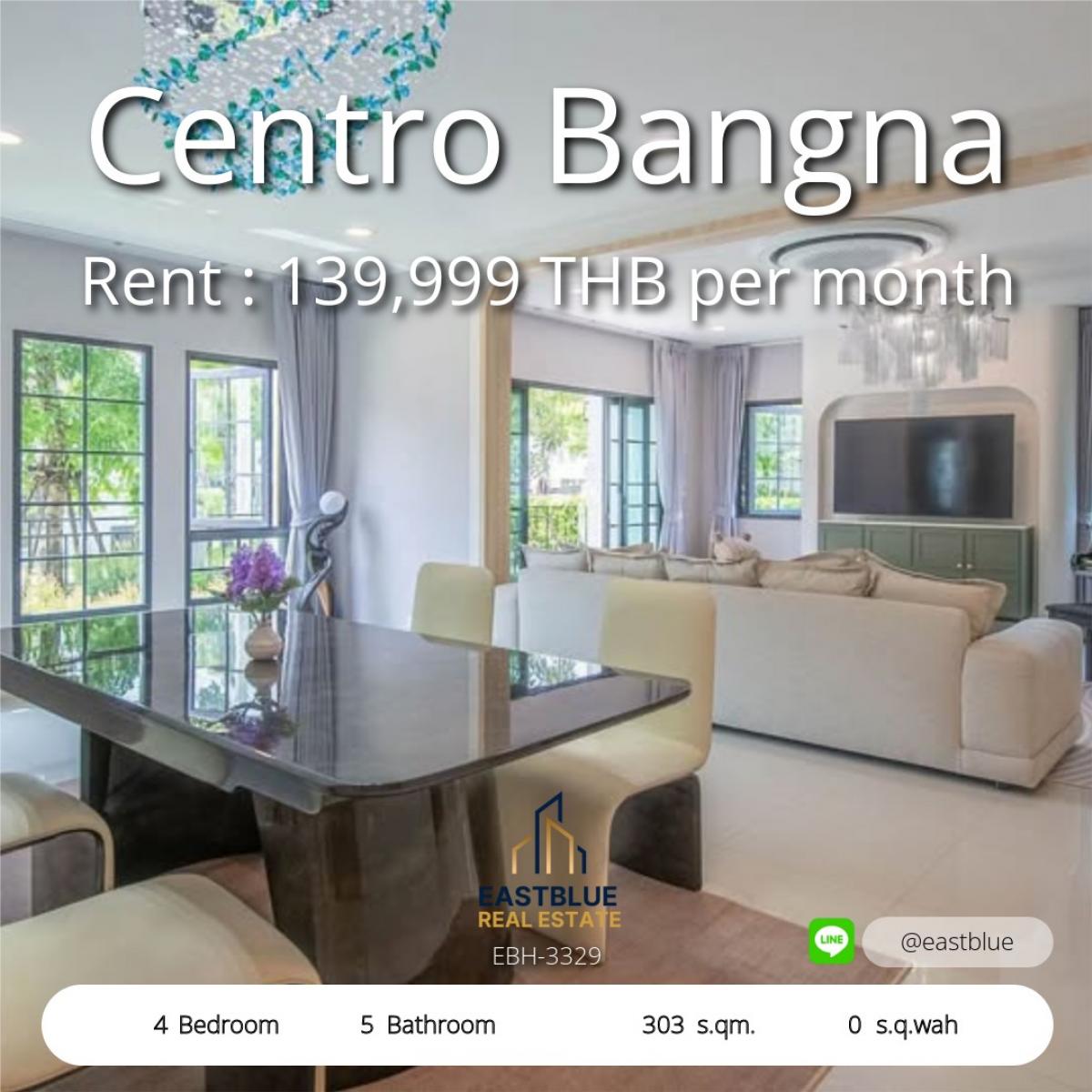 Project : Centro Bangna 2 ID : EBH-3329 4 Bed 5 Baht House Area :303 sqm Land Area :0 sq.wah Rental Price : 139,999 THB per month Selling Price : THB . ิติดต่อ Contact, Appointment for viewing. call: