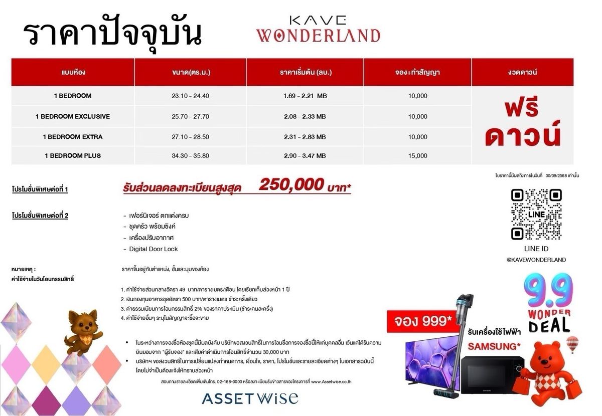 Condo down payment for sale, Kave wonderland , cheap price during pre-sale before returning project rights. and put it up for sale at a price higher than the contract price by another 100,000 baht. The period ends this November. 2568‼️ . Property details Position: E0313 Building E, 3rd floor Type: 1 bedroom, size: 23.5 sq m. Free full furniture. Ready to move in Contract price: 1,740,000 baht Discount: 150,000 baht Price after discount: 1,590,000 baht . Down payment sales details Down payment already paid: 103,500 baht (completed) ⭐️Resale down payment: 123,500 baht ⭐️(Negotiable) . If you are already looking for a condo in this location, whether you live in it yourself or rent it out. This is a good price. But please contact me quickly. Before the opportunity runs out⏳ . Contact: Tel. Contact number Line id: golfsongklod