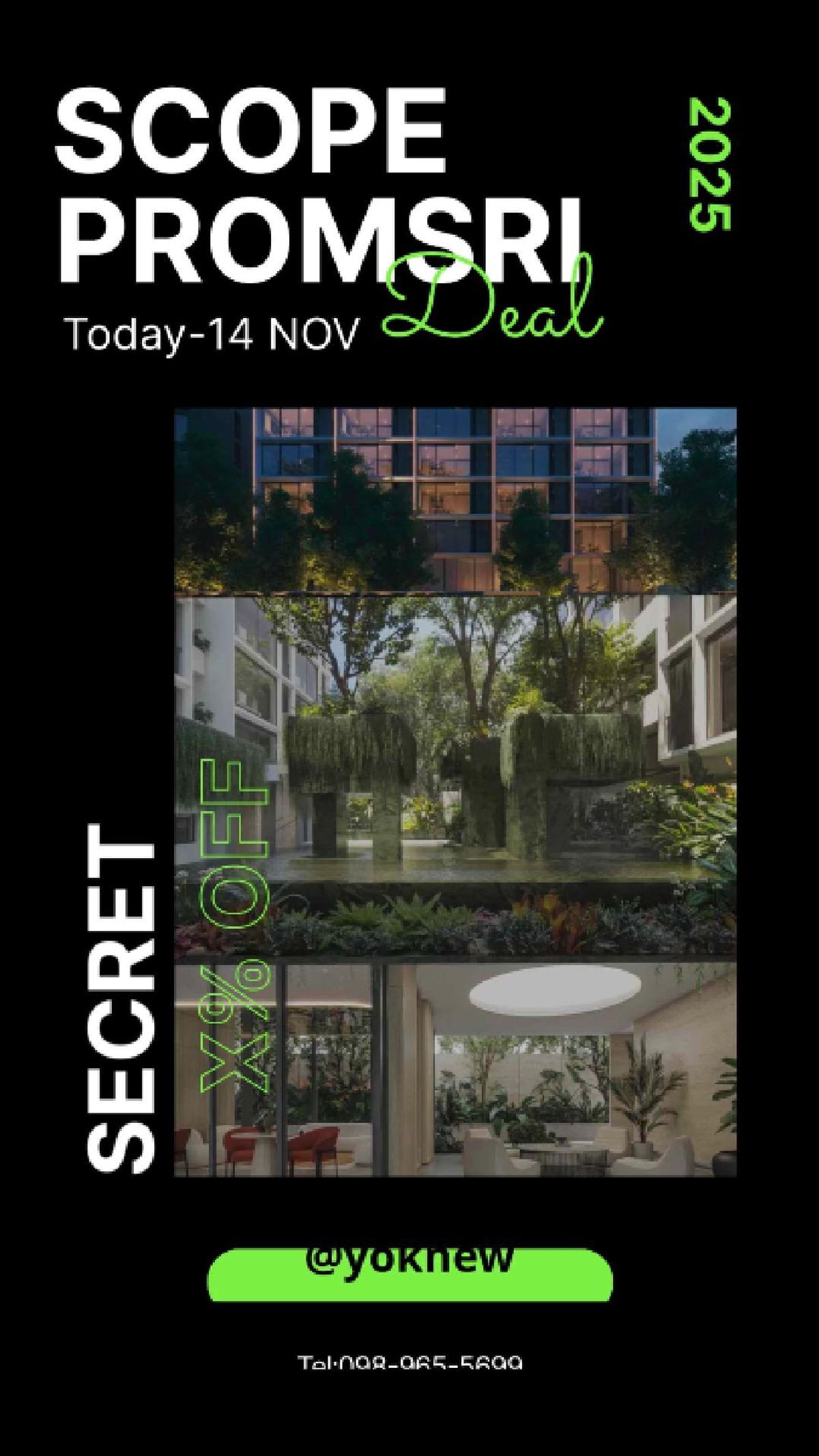 SCOPE Promsri – The Finest Low-Rise Residence Luxury condo in the heart of Sukhumvit 49/11 Fully Furnished by Ligne Roset with guaranteed highest rent Only 146 units 1 bedroom, size 28–34 sq m. Guaranteed rent of 1,000 baht per sq m for 12 months. - Court 28 sq m. | Starting at 6.71 million baht - Ville 30 sq m. | Starting at 6.76 million baht - Wind 34 sq m. | Starting at 8.78 million baht 📍 Sukhumvit 49/11 opposite The Racquet Club 📆 Reserve and transfer within 14 November. 2568 📄 BOOKING: 30,000 | TRANSFER: 99% (30 Day after booking) 📞 Call: Contact number | 💬 LINE@: @yoknew 🌐 yoknewproperty.weeblysite.com