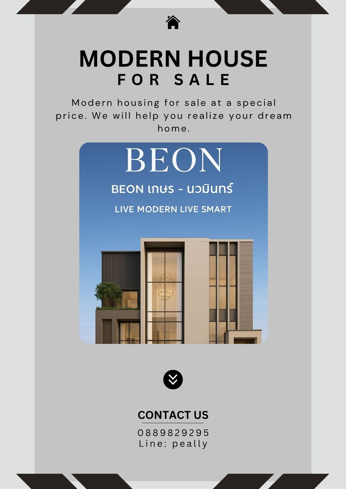 🏡 BEON เกษร-นวมินทร์ Live Modern. Live Smart. สัมผัสความหรูหราเหนือระดับ ในทำเลศักยภาพย่านเกษตร-นวมินทร์ บ้านดีไซน์โมเดิร์น 3 ชั้น ที่ออกแบบเพื่อการใช้ชีวิตอย่างชาญฉลาด ครบทุกฟังก์ชันด้วยพื้นที่ใช้สอยขนาดใหญ่ รองรับทุกไลฟ์สไตล์ของคนรุ่นใหม่ ✨ บ้านที่สะท้อนรสนิยมของผู้นำยุคใหม่ ✨ พื้นที่ใช้ชีวิตที่ตอบโจทย์ทั้งการพักผ่อนและการทำงาน 📍 ทำเลศักยภาพ ใกล้ถนนใหญ่ และสิ่งอำนวยความสะดวกครบครัน 💰 เริ่มต้น 45 ล้านบาท*