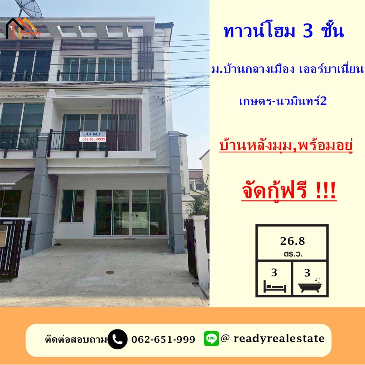 Townhome for sale, 3 floors, 26.8 sq m, Ban Klang Muang Village. Urbanion Kaset-Nawamin 2, corner house, convenient travel, close to amenities 3-story townhome, area 26.8 square wah, usable area 150 square meters 3 bedrooms, 3 bathrooms, 1 kitchen, 1 living room, 2 parking spaces -Common fee: 45 baht / square wah Decoration >1st floor Flooring with granite tiles > 2nd and 3rd floors Flooring with laminate Project: Baan Klang Muang Urbanion Kaset-Nawamin 2 Location: Soi Lat Pla Khao 79 Lat Pla Khao Road / Ramindra Road, Anusawari Subdistrict, Bang Khen District, Bangkok 10220 Coordinates: https://maps.app.goo.gl/FafHHb44Gn4K1HBZ9 Convenient transportation >Enter-exit in many routes. For example >Ramindra Road Kaset-Nawamin Road, Phahon Yothin Road, Vibhavadi Rangsit Road Lat Pla Khao Road >Ratchada-Ramintra Road Near Don Mueang Airport Selling price 4,600,000 baht Highlights - Beautiful house. Behind the corner - easy to travel Close to amenities - Free credit arranged. facilities - park - Swimming pool – Clubhouse, fitness, – 24 hour security guard / CCTV Nearby places – MRT Pink Line Ramintra 23 Station – Crystal Park Crystal Design Center / Central Ramintra – Sripatum University / Satri Witthaya School 2 – Synphaet Hospital / Paolo Kaset Hospital – Ramintra-At Narong Expressway / Motorway If interested, ask for more details, Khun Oil, telephone number Contact number Line: @ readyrealestate