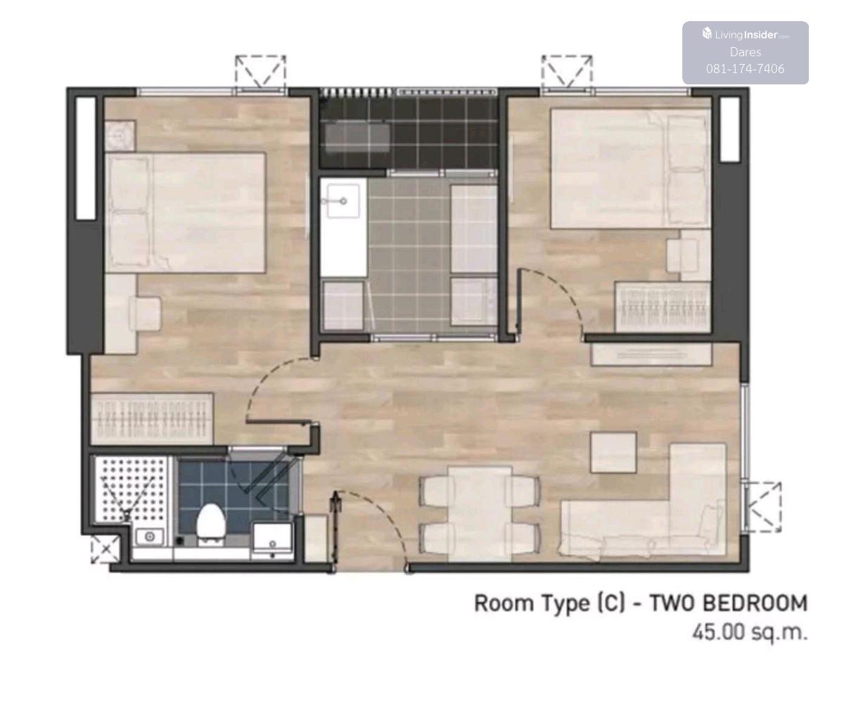 2 bedrooms 1 bathroom fully built-in furniture Complete electrical equipment 3 air conditioners LED TV 40" Refrigerator Washing machine Water heater Separate kitchen.