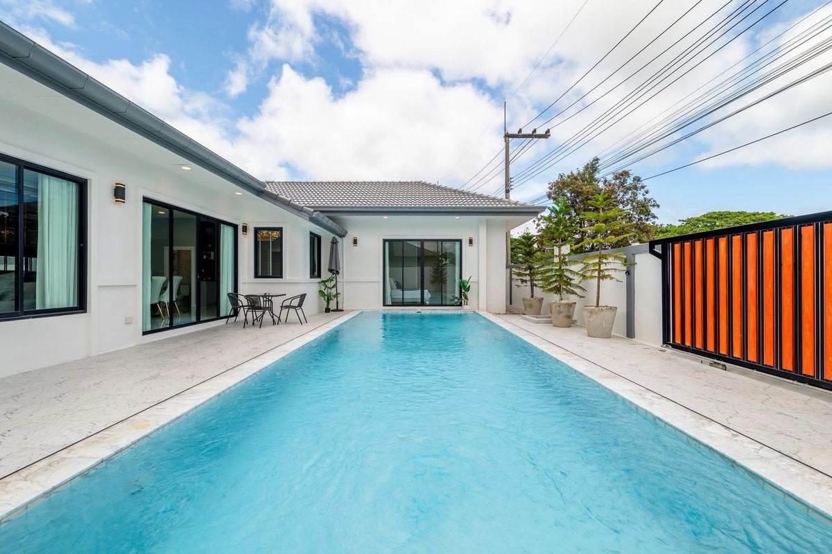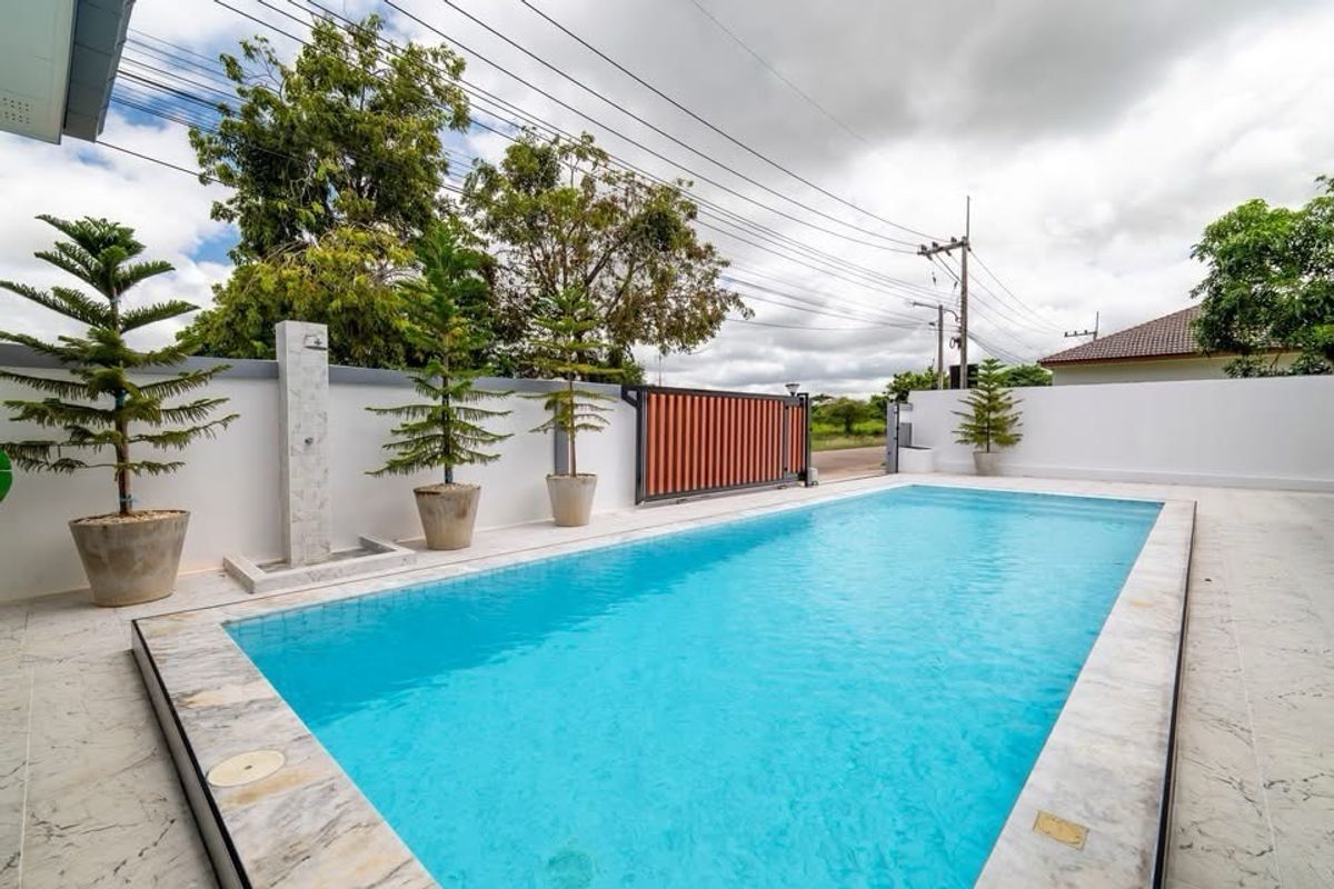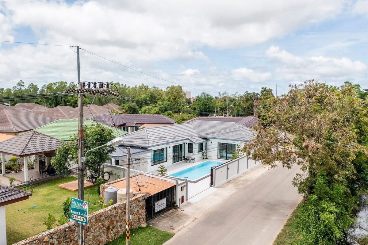 A brand nee pool villa for sale Modern Style Land size 107 sq m Location : Huai Yai 3 bedrooms, 3 bathrooms Private swimming pool 4x11 meters Garden European kitchen and Thai kitchen, parking for 4 cars , fully furnished. Ready to move in not in a village, no common fee Ownership : Thai name