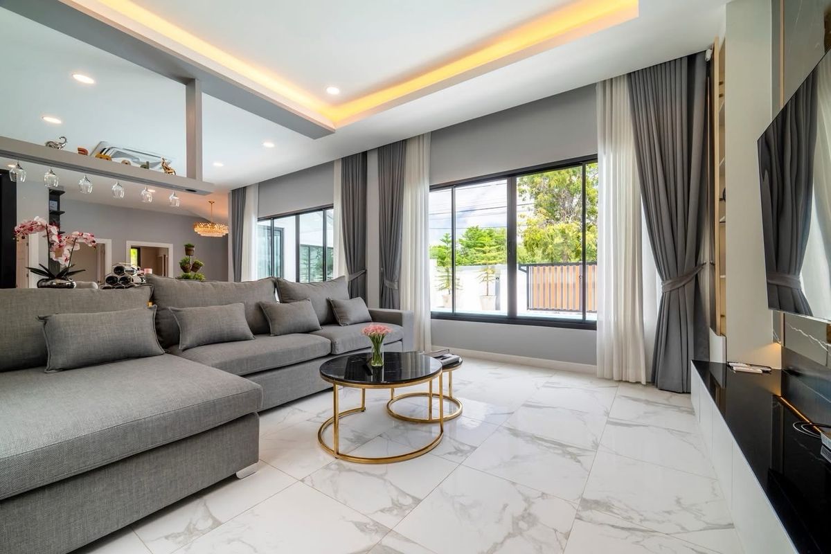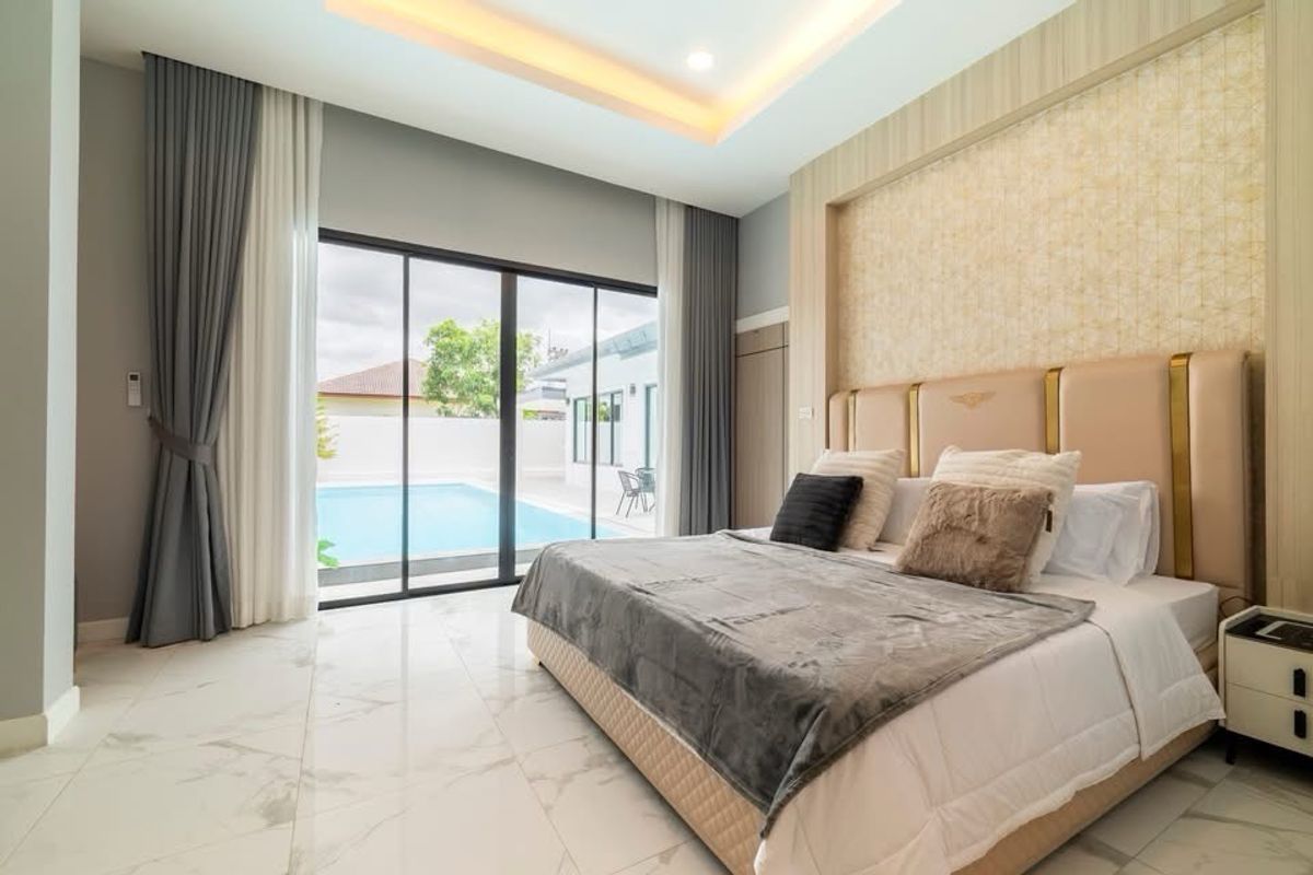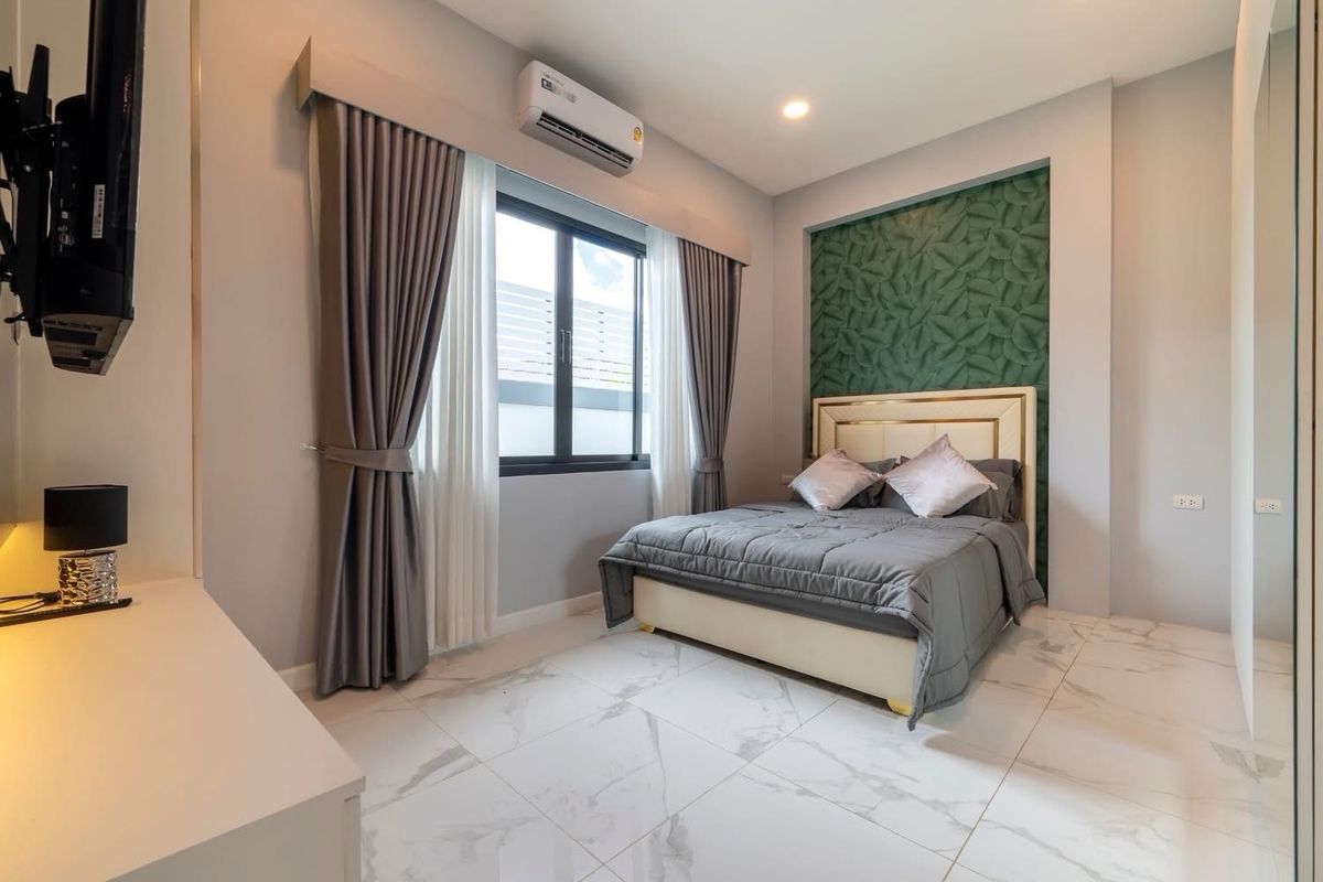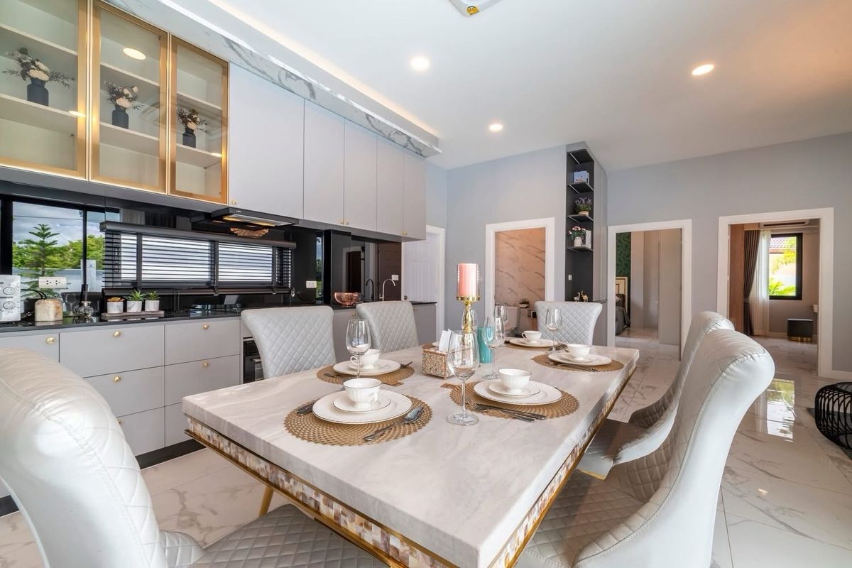 A brand nee pool villa for sale Modern Style Land size 107 sq m Location : Huai Yai 3 bedrooms, 3 bathrooms Private swimming pool 4x11 meters Garden European kitchen and Thai kitchen, parking for 4 cars , fully furnished. Ready to move in not in a village, no common fee Ownership : Thai name
