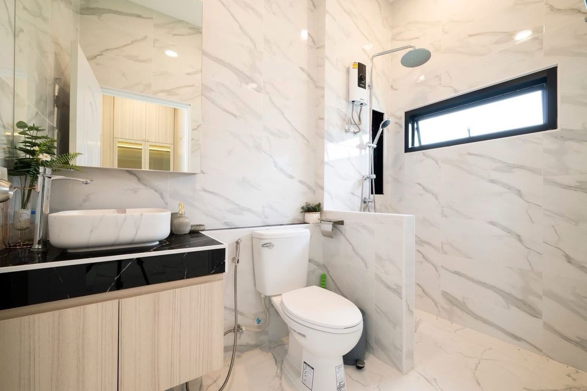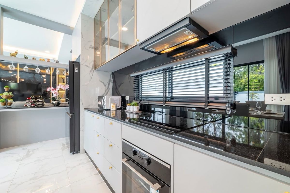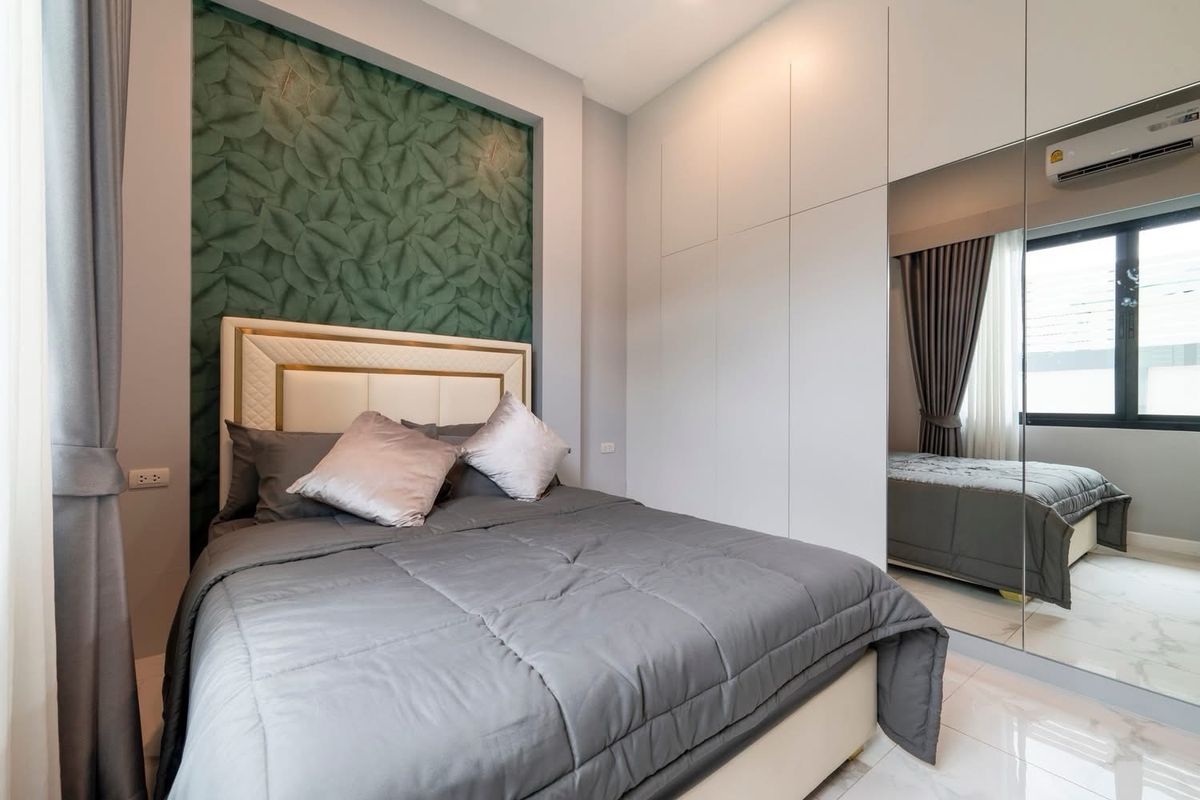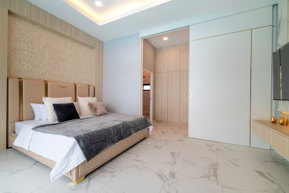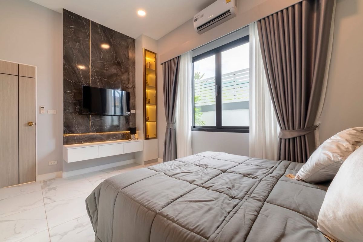 A brand nee pool villa for sale Modern Style Land size 107 sq m Location : Huai Yai 3 bedrooms, 3 bathrooms Private swimming pool 4x11 meters Garden European kitchen and Thai kitchen, parking for 4 ca