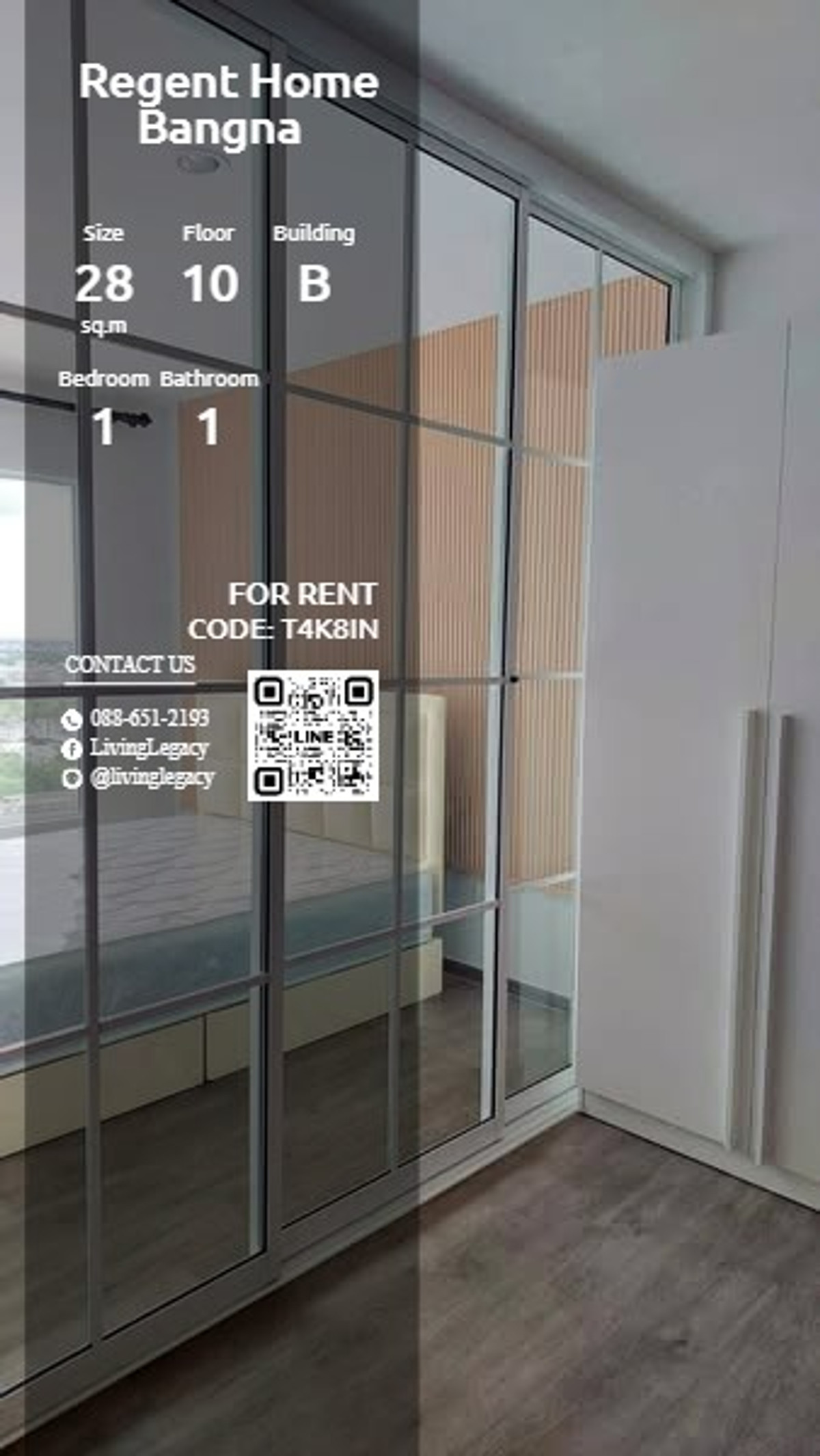 🏠 T4K8IN Condo for rent Regent Home Bangna 28 sq m, 10th floor, Building B, 1 bedroom, 1 bathroom ✨ Ready to move in immediately! Beautiful room, fully decorated Ready to move in! 🔍Details - Number of bedrooms: 1 - Number of bathrooms: 1 - Usable area (sq m): 28 - Floor: 10 - Building: B 🌟 Highlight this room! 🌟 🌟Various amenities 📞 Hurry and reserve now! Ask for more details Price 11000 baht Property code: T4K8IN If interested, contact Add Line ID: @livinglegacy Facebook: LivingLegacy WhatsApp: https://wa.me/ Contact number Interested in other rooms in the project, click: https://living-legacy.atrobot.asia/property-listing/6714e2ed2ed4c0ae91b6a9fb #RegentHomeBan gna #BerkeleyInternationalSchool #TheIvySchool #DiWaveryPlaceCommunityMall #SimilaCompan yLimited #GeriatricKluaynamthai2Hospital #GlorySingaporeInternationalSchoolSoi30Campus #Go ldSwimAcademy #Campus101 #RuamjairakHospitalSukhumvit62 #SuperblockPublicCompanyLimited