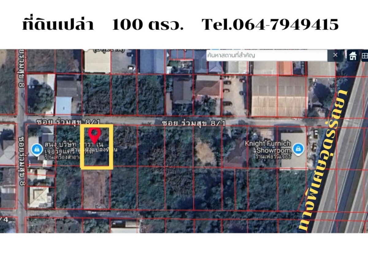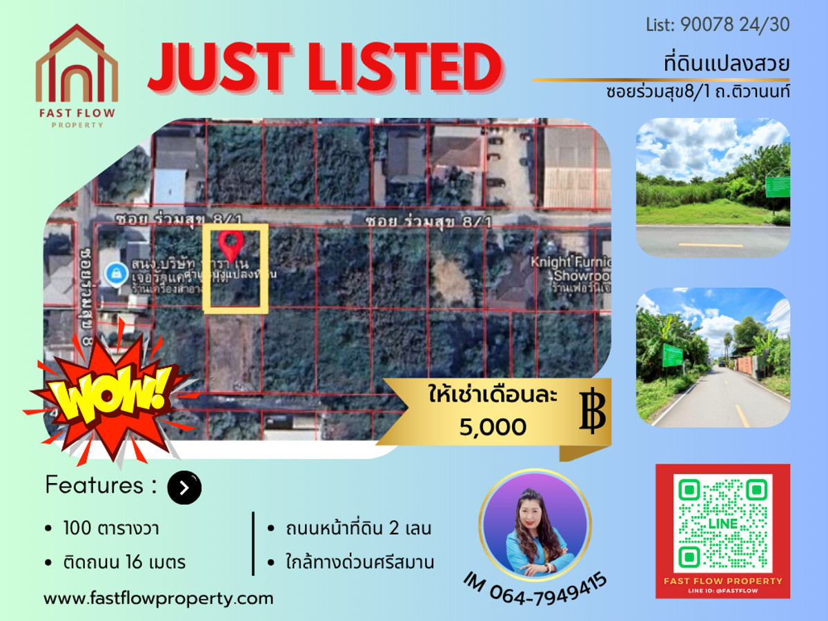 Land for rent, 100 square wah, on Tiwanon Road, Soi Ruamsuk 8/1, with approximately 16 meters of frontage. Near the Sri Saman Expressway and Khlong Prapa Road, Ban Mai, Mueang Pathum Thani District. Contact Runyarat Fast Flow Property at Contact number or Contact number Line ID: Contact number Listing number: 90078 Property Details: - Land for sale, 100 square wah, Soi Ruamsuk 8/1, Tiwanon Road - Approximately 16 meters of frontage, approximately 25 meters deep - Ideal for a warehouse, retail space, or home office - Two-lane road with convenient traffic flow Nearby Locations: - Bang Pa-in - Pak Kret Expressway, Udon Ratthaya Expressway, Sri Saman Expressway - St. Joseph's School, Muang Ek, Rangsit Wittaya Suksa School, Pathumwilai School - Bhumibol Hospital, St. Carlos Hospital, Pathum Thani Hospital - Robinson Sri Saman, Muang Thong Thani, Lotus Pathum Thani Location: https://maps.app.goo.gl/4Qi53FhUUV3GP71a9 Rental Price: 5,000 baht Visits are available daily. Price negotiable. Contact Khun Runyarat (Im) at Contact number, Contact number Line: Contact number Contact Fast Flow Property Office Tel: Contact number Line ID: @fastflow FB page: facebook.com/fastflowproperty www.fastflowproperty.com Real estate listing services for all types. Free advertising.