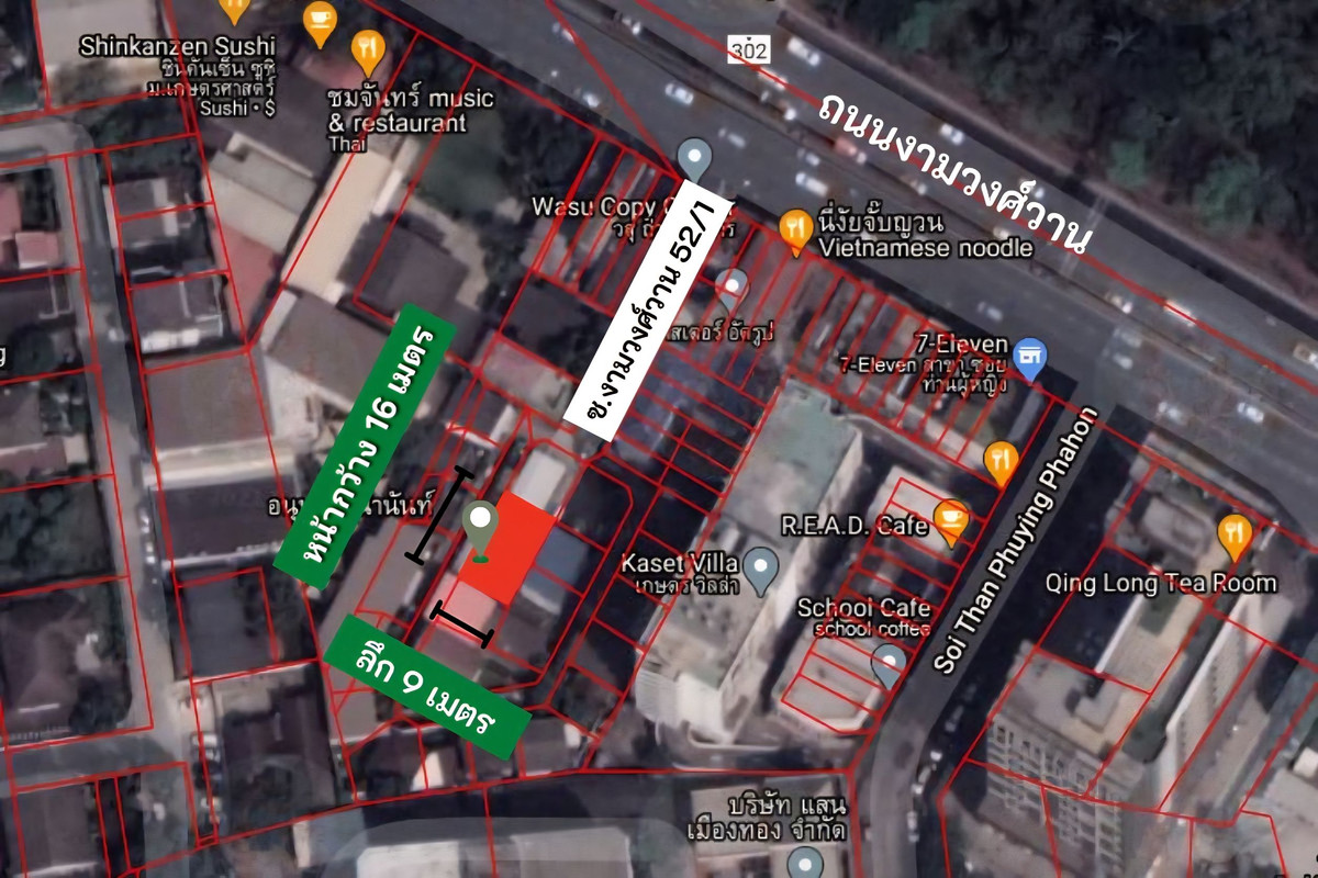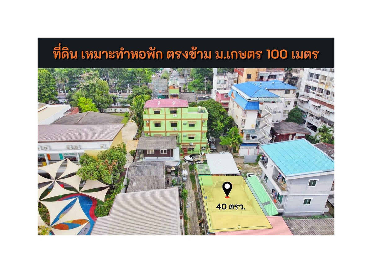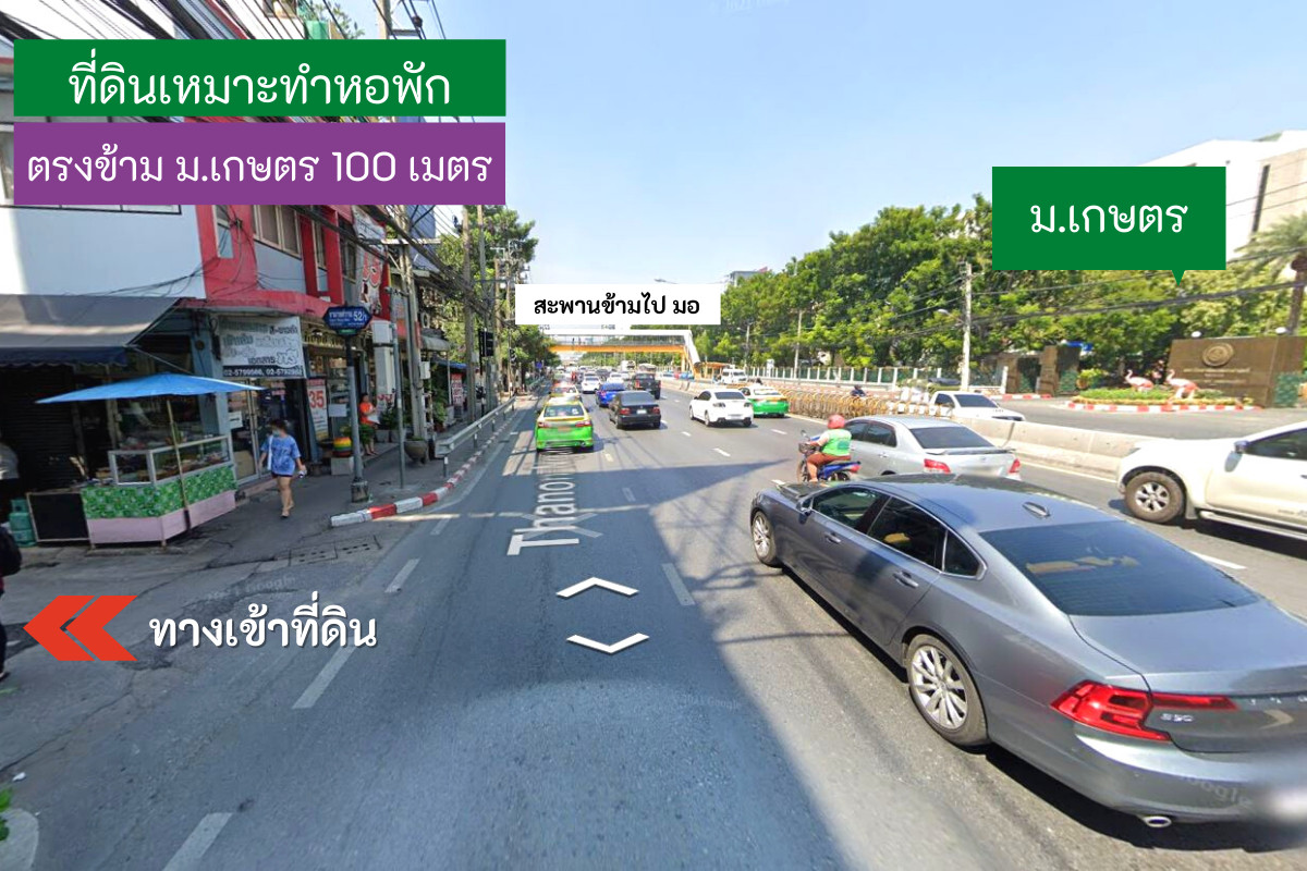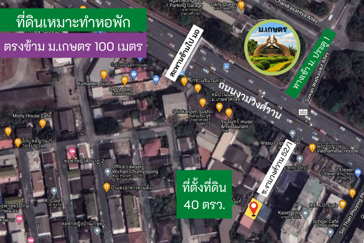 Land for sale in Ngamwongwan, prime location, opposite Kasetsart University, 100 meters, very suitable for investment Land can be used to build a student dormitory. Definitely good profits (Year 2028, the Brown Line train passes in front of the alley, the BTS station (Kaset University) . Location Soi Ngamwongwan 52/1 Only 70 meters from the main road in Ngamwongwan , only 400 meters to the entrance to Kasetsart University (Gate 1 Ngamwongwan) . Exit the alley, turn left, see a footbridge, walk across to Kasetsart University, just 5 minutes to turn right and see 7-11, very convenient for living . Land size 40 sq m. Width 18 meters, depth 9 Meter . Land suitable for building a student dormitory. Can be built 3-story apartment with 12 comfortable rooms. . Landowner There are plans and permits for dormitory construction already passed , very suitable for investment. This alley has students all the time looking for rooms to rent. Average room price 6,500 -7,000 baht/month _________________________________ Selling price only 5.49 million baht Buyer who purchases can extend to run a dormitory business. And the price of land is increasing in value every day. Location of the BTS passing in front of the alley _________________________________ Contact for inquiries Khun Prang: Contact number LINE: @home01 https://lin.ee/4AA1CXA