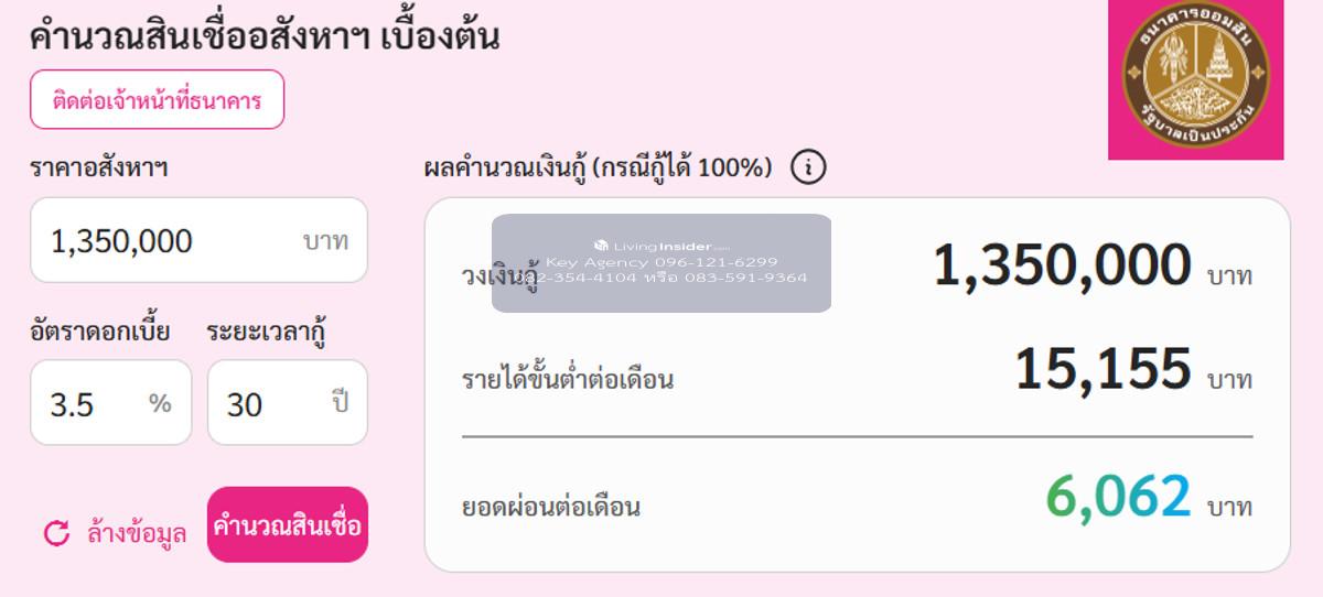 Contact a bank officerThe numbers displayed will be exclusive to borrowing. With a simple calculation method, a salary of 10,000 Baht will be able to borrow approximately 650,000 Baht.