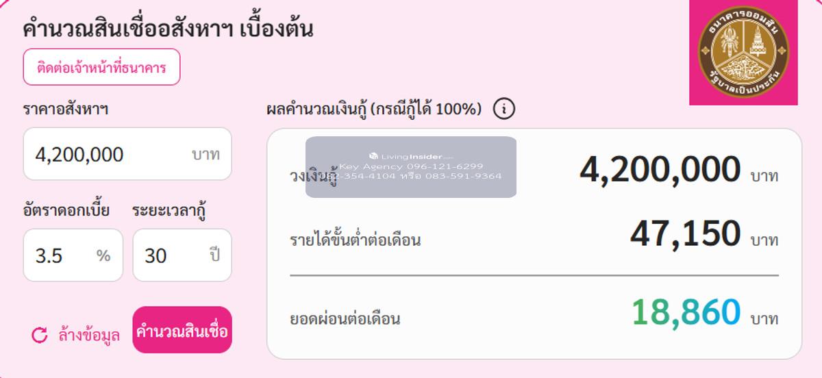 Contact a bank officerThe numbers displayed will be exclusive to borrowing. With a simple calculation method, a salary of 10,000 Baht will be able to borrow approximately 650,000 Baht.
