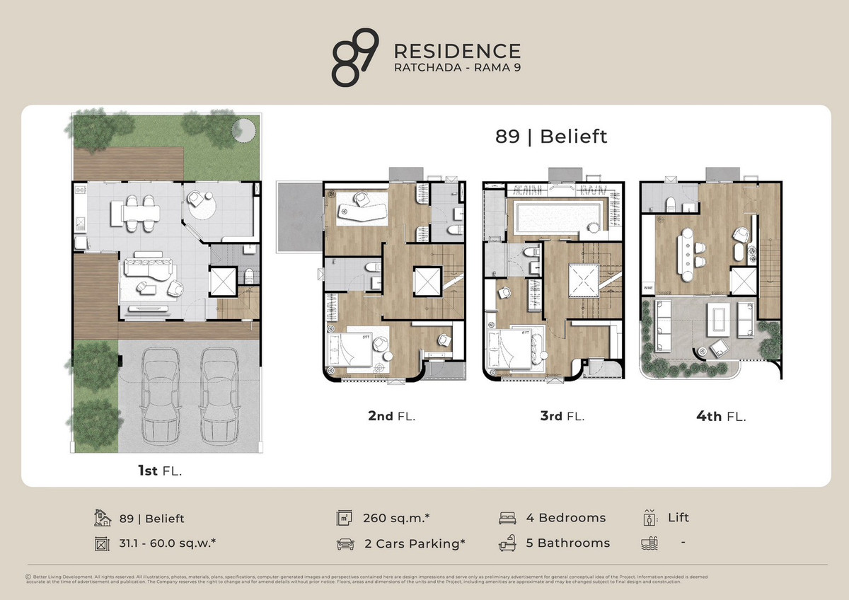 **Special price, only 1 house left** Become the owner of a luxury townhome in the middle of the city, the best location of the year today!!! : "Better Living Development" sends the project "89 Residence | Ratchada - Rama 9", a new concept house, Natural Luxury Residence, a new concept house, 4-storey independent style, with a private Rooftop Louge. Garden at the top of a potential location in the heart of the New CBD Rama 9 business, under the concept "Time Is A True Wealth", offering exclusive privacy rights only for 20 families. At a starting price of 18.89 million baht* This has been designed under the concept of "Time is a True Wealth" Time is the true wealth of life. Its like buying time by buying a house because from its location as Bangkoks Center Of Everyting, you can travel to any destination across the city within minutes. In addition, the highlight is Every house that is here House number 89 is considered an auspicious number that will make this place filled with positive energy : Project: 89 Residence Ratchada-Rama 9 (New !) Style: Freestanding townhome, 4 floors high Starting area: 28 - 64 sq m Usable area: 235-285 sq m Bedrooms: 4 / Bathroom : 5 Function : Elevator inside the house, private swimming pool Conditions of sale: Leasehold real estate with leasehold rights for a period of 30 years : Nearby places: MRT Cultural Center - 900 meters The Street Ratchada - 800 meters Big C Place Ratchada - 850 Meter : International School SISB International School Bangkok Bilingual School KIS International School : Hospital Phraram Hospital 9 Samitivej Hospital Bangkok Hospital : Register to view the project privately today Contact us : TH / ENG Tel : Contact number / Contact number Line : 89residence / Comsnk