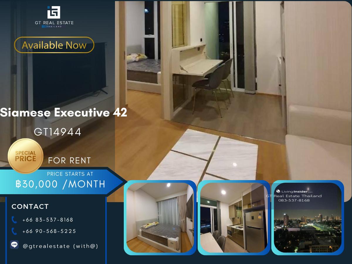 CODE : GT14944 Project : Siamese Executive 42 Type : 1 bedroom 1 bathroom Size : 37 sq m Floor : 11+ Building : - MRT/BTS : BTS Ekkamai Rental Price : Special price only 30,000 baht per month!!! From