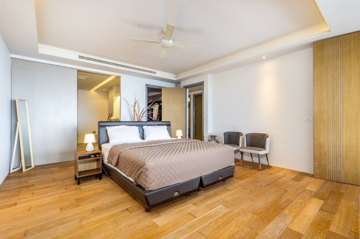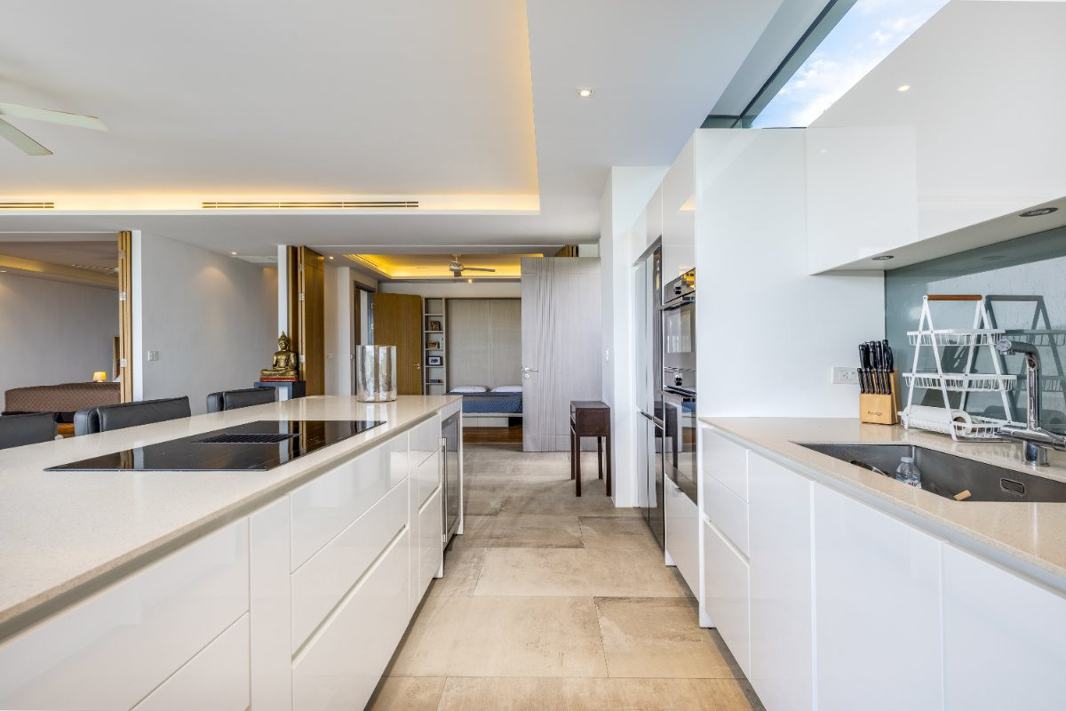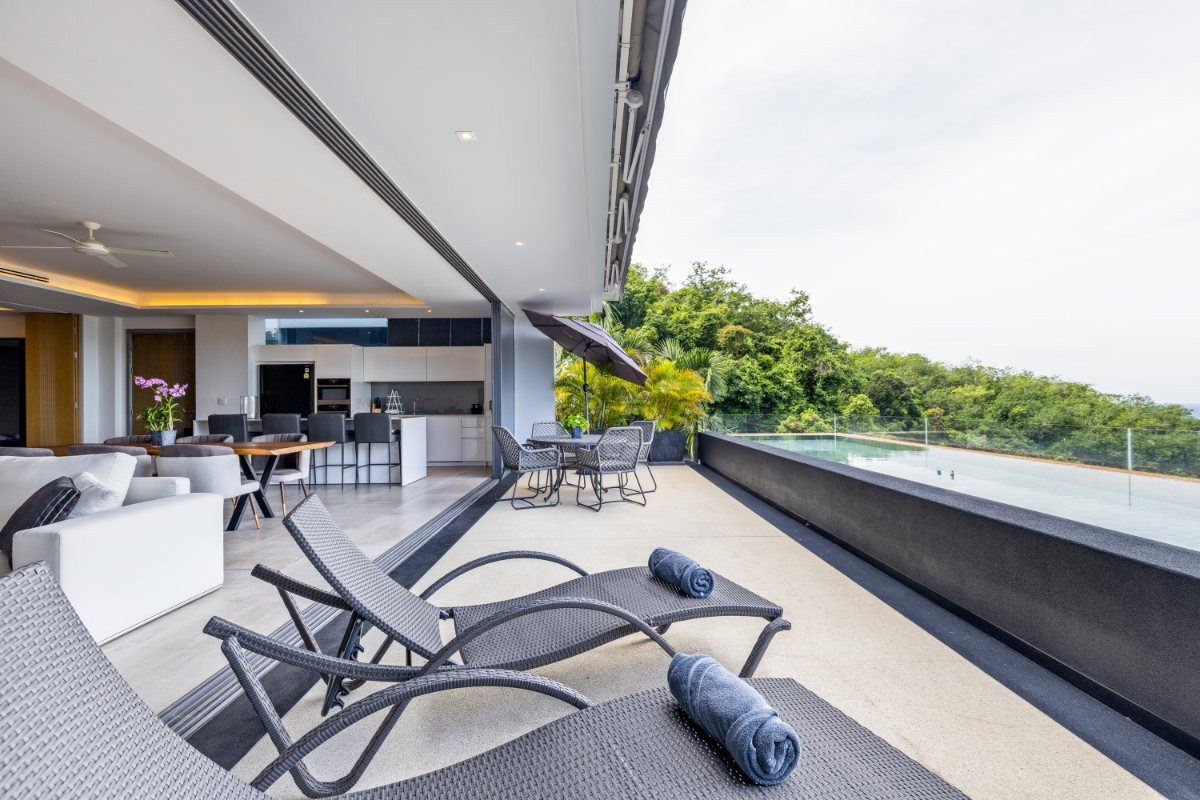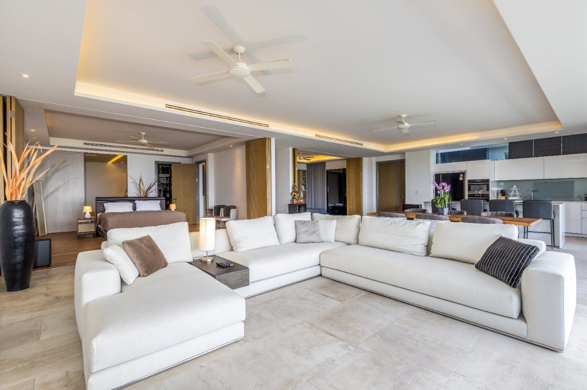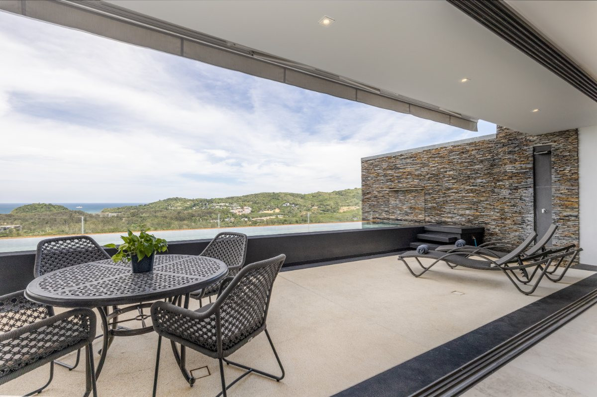 This elegant three-bedroom hillside residence offers 272 square metres of indoor and outdoor living space, designed to take full advantage of the west-facing sea and sunset views over Layan Beach. The spacious terrace spans the full width of the home and features an 11.5-metre private infinity pool with a graceful waterfall edge — the perfect setting for entertaining or relaxing in complete privacy. The interiors are thoughtfully designed with an open-plan layout that includes a fully equipped Western kitchen, generous dining area, and a lounge that flows directly onto the pool terrace. A fold-away window system allows the living space to open entirely to the view, blending indoor comfort with outdoor living. All three bedrooms are ensuite, with the master suite boasting vaulted ceilings, hardwood floors, a walk-in wardrobe, and a spa-style bathroom with twin rain showers and a sculpted bathtub. Set within a private residential development of just 18 units, the apartment includes covered parking, elevator access, and a professionally managed rental program for owners seeking strong returns. With its elevated location, high-quality construction, and turnkey furnishings, this residence presents a rare opportunity to own a luxury sea-view home in one of Phuket’s most desirable neighbourhoods.